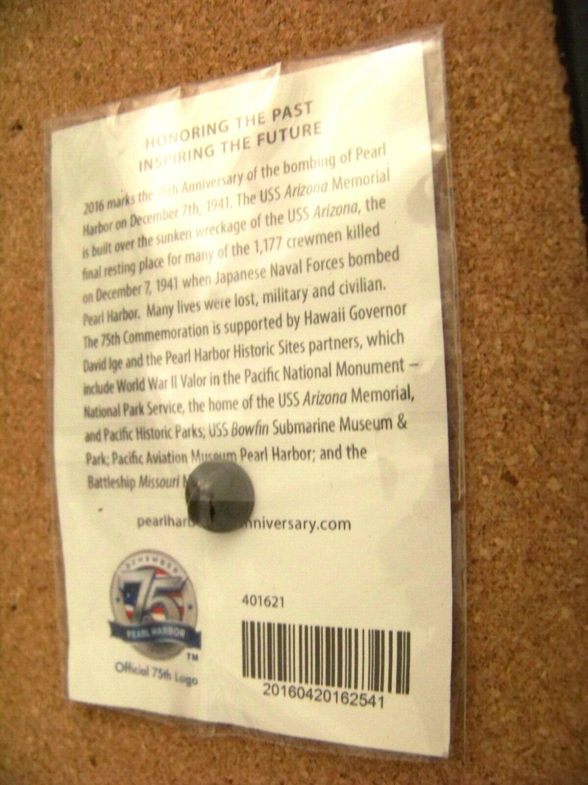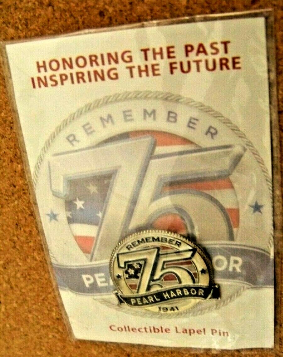 2016 Remember Pearl Harbor 1941 75 pin ( 75th Anniversary ) Honoring the Past... This gold tone, post and plug backed pin measures about 1.15" tall. Has a plastic card sleeve over it but that's probably not original. The pin has no problems and looks to be new. The backing card has some light creasing and bends. Don't forget to click on my "Stores" link, next to my eBay name, to see other items I currently have listed for sale, or you can copy and paste this address into your browser: stores.ebay.com/highcountrycollectibles SHIPPING INFORMATION Shipping to U.S. addresses is FREE! HIGH COUNTRY COLLECTIBLES Since 1989 – A LEADER IN THE DENVER SPORTS MEMORABILIA MARKET. Check out my other auctions and listings, and keep an eye out for the different, unusual, and EXCLUSIVE items available nowhere else but from High Country Collectibles.