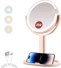 Dual Side 1x/20x Magnifying Lighted Mirror: This magnifying makeup mirror comes with 1X and 20X mirror, the 1X is suitable for daily use and the 20x magnifying mirror is suitable for delicate operations such as eyelash plucking, eye lash installation, wearing contact lenses,and removing blackheads, it's not only suitable for young women, but also the first choice of makeup mirrors for seniors and cataract patients 3 Colors Vanity Mirror: This lighted makeup mirror comes with 3 different colors and Adjustable Brightness.Long press touch button can adjusts the light intensity, short press touch button can change the color of the light, which can meet the makeup needs of different scenes and different lighting environments 80 LEDs and 2000 mAh Battery: This 20x desk mirror comes with 80 energy saving LED lights with 100,000 hours life. And most lighted mirrors on the market only have 42 or less LED counts. The battery capacity is 2,000 mAh, which provides a long use time and reduces the number of recharges Ingenious Design: The top of this mirror with lights is a 360 degree rotating double sided, you can switch between a flat mirror and a 20X magnifying mirror at any time. The base is a phone holder and you can place your phone horizontally/vertically on the mirror's phone holder to watch tiktok or makeup tutorials while applying makeup Note: When you use this 20X lighted magnifying mirror, keep your face close enough to the mirror (<5 inches) or you'll get an upside down / blurred / distorted facial pattern. Because everyone's eyesight is different, please try several times to find the most suitable viewing distance for you Product Description Double-Sided Magnifying Mirror with Light 20X Magnifying Mirror The 20X Magnification has unparalleled magnifying power to help you better perform fine make-up operations. 1X Flat Makeup Mirror 1X HD Flat Mirror is suitable for everyone's daily use, perfect for home and traveling. Makeup Mirror with Light This magnifying mirror is lighted on both sides, so no matter which side you use, you can switch between three bright and dim lights at will Products Introduction 80 LED Lamp Beads 3 Color Temperatures Stepless Brightness Adjustable 2000mAh Rechargeable Battery 1X&20X Magnification 360° Rotation