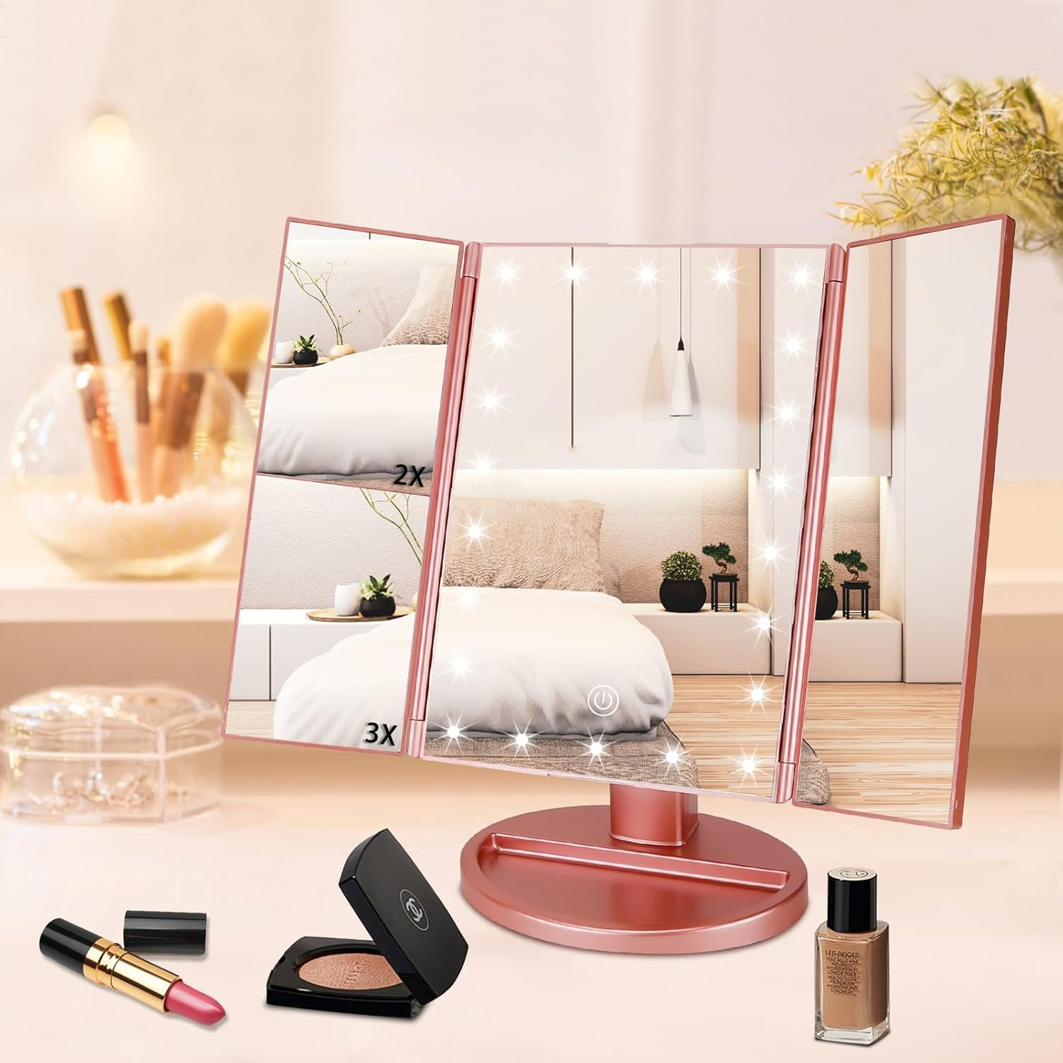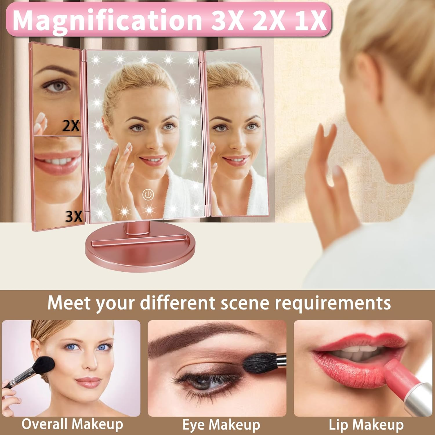 Store New Arrivals Add to Favorite View Feedback Contact Lighted Makeup Mirror 3X/2X/1X Magnification 21 LED Trifold Vanity Mirror with Touch Sensor Dimming Portable Travel Mirror Best Xmas Gifts for Women Girls Description Style Modern Number of Items 1 Theme Modern Frame Color Black Number of Pieces 1, 4 Room Type Bedroom Assembly Required No Product Dimensions 11"L x 7"W Material Glass Frame Material Acrylonitrile Butadiene Styrene (ABS) Finish Type Painted Specific Uses For Product Makeup Frame Type Framed Item Weight 1.96 pounds Surface Recommendation Plastic Special Feature Cordless Mounting Type Floor Mount Color Rose Gold Is Hanging No Shape Oblong Size 11"L x 7"W Bright Make up Mirror: Built-in 21 LED lights, the makeup mirror with lights provide a great vanity for makeup, dim or brighten up the lights by long pressing of touch screen switch, allow you makeup in various lighting situations like daytime, evening, bedroom and office, bright but not dazzling, protecting your eyes. Magnification Mirror: The vanity mirror with lights has 3X/2X/1X Magnification and wide-angle viewing for the best and most detailed makeup results, see clearly your face and make a flawless makeup, suitable for desk makeup and handheld using. Best Gift for Women & Girls: JAMIEWIN high quality personal makeup mirror is an fabulous present for wife, friend, lover, mom, sister, ideal gifts for Christmas, birthday Thanksgiving, Valentine's Day, Mother's Day, anniversary days,birthday and etc. 180 Degree Free Rotation Trifold Mirror : The led vanity mirror can be adjusted to your suitable viewing angle you wish so that you get the best view, trifold and detachable design makes it portable to take wherever you go, ideal for travelling using. Dual Power Supply: The lighted magnifying mirror is powered by 4xAA batteries (not included) or USB cable (including), the light up mirror for makeup can not store power by itself. The makeup mirror with lights and magnification is designed with natural and soft lights, the high definition glass is more clear and enables a better image, the mirror surface is designed with premium quality coating. Product Description ABOUT US We offer the best prices around on high quality products. Our E-store includes media such as books, movies, music and games while offering electronics, toys, sporting apparel, clothing, tools, general home, garden items and more. SHIPPING We are always working hard to ensure your package arrives as soon as possible. Please understand that some factors like weather, high postal traffic, and the performance of shipping companies are outside of our control. We offer free shipping to the lower 48 states and ship within 2 business days of payment, usually sooner. We do not accept P.O. Boxes. Please provide a physical address. For shipping outside of the continental USA, we only use eBay's Global Shipping Program.The item is shipped to KY and then sent to the rest of the world. International customers are responsible for all duties and taxes. Continue to check out in order to calculate costs for shipping the item to your country. Messages regarding eBay's Global Shipping Program MUST be directed at eBay EXCLUSIVELY. RETURNS We offer a 30-Day Return Policy on items which you are not completely satisfied with. You have the option for a full-refund or an exchange of the item. No returns are available on items shipped outside of the USA. PAYMENT We accept PayPal. CONTACT US This page content is yet to come Please ad us to your favorite seller and visit again later Thank You CUSTOMER SATISFACTION We try our very best to make sure every customer is completely satisfied. If there's a problem, message us! We're happy to help. WE ACCEPT Copyright © 2021 AutoDS. | All Rights Reserved