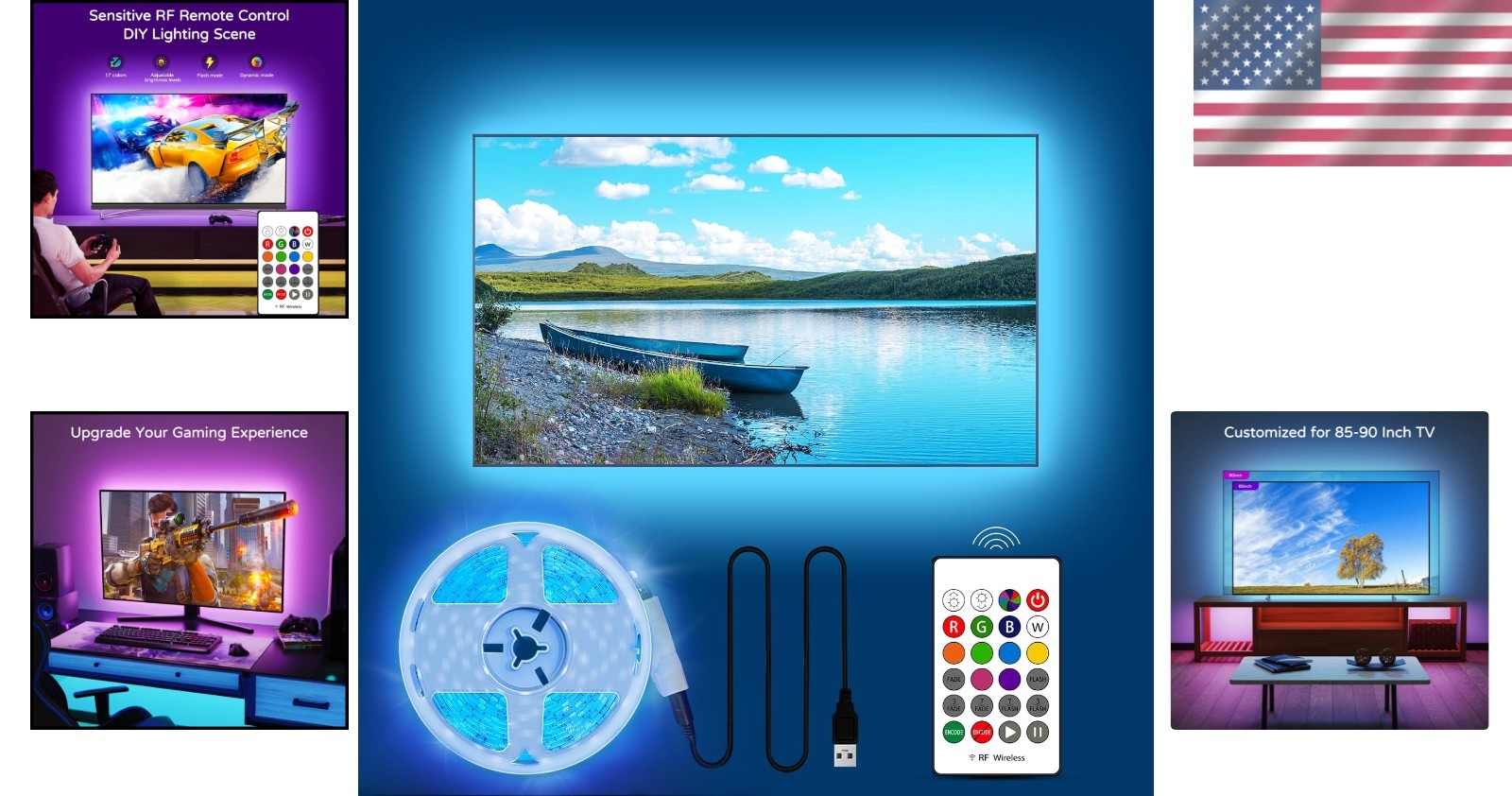 LED Strip Lights 21Ft USB TV Backlight Multi-Color Dimmable Remote Indoor ‹ › ‹ › ‹ › ‹ › ‹ › ‹ › ‹ › ‹ › ‹ › Transform Your Entertainment Space with Custom LED TV Lighting Enhance your viewing experience with versatile LED strip lights designed to fit 85-95 inch TVs. Easy to install and customizable, these lights bring vibrant colors and seamless synchronization to your home theater or gaming room. Custom Fit – 21-foot LED strips cover all four sides of large TVs for immersive ambient lighting. Easy Installation – Flexible W-shaped strips attach effortlessly behind TVs, sofas, or desks. Vibrant Colors & Modes – 17 colors, 10 dynamic modes, and adjustable speed for personalized lighting. Smart Sync – Automatically syncs with most TVs and remembers your favorite settings. Quality – Metal housing and 5000K LED lights offer durable, energy-efficient illumination. Upgrade your entertainment setup today! Limited stock available for immediate shipment. Create an immersive environment that responds to your mood and content with easy-to-use controls and reliable performance. Experience the difference – durable materials, vivid colors, and seamless connectivity ensure your satisfaction. Ready to elevate your home theater? Order now and enjoy an instant upgrade! UPC: 778299093965 Size: for 85-95inch Lumens: Not specified Item Height: 0.3 centimeters Power Consumption: 5 watts Unit Quantity: 1 Features: With Remote Control,color changing,dimmable,instant on,remote controlled Light Color: Multicolor,White Occasion: Christmas Control Style: Remote Control Room: Living Room,Indoor Material: Metal Type: LED Lights Lighting Technology: LED Light Shape: FC10 Sensor Type: None Color: Multicolor Power Source: USB Cord Color: Multicolor Number of Settings: Not specified LED String/Strip Type: Not specified LED Chip Code: Not specified Voltage: 5 volts Output Voltage: Not specified Amperage: Not specified Style: Modern Number of Lights: 117 Color Temperature: 5000 kelvins Bulb Life Hours: Not specified