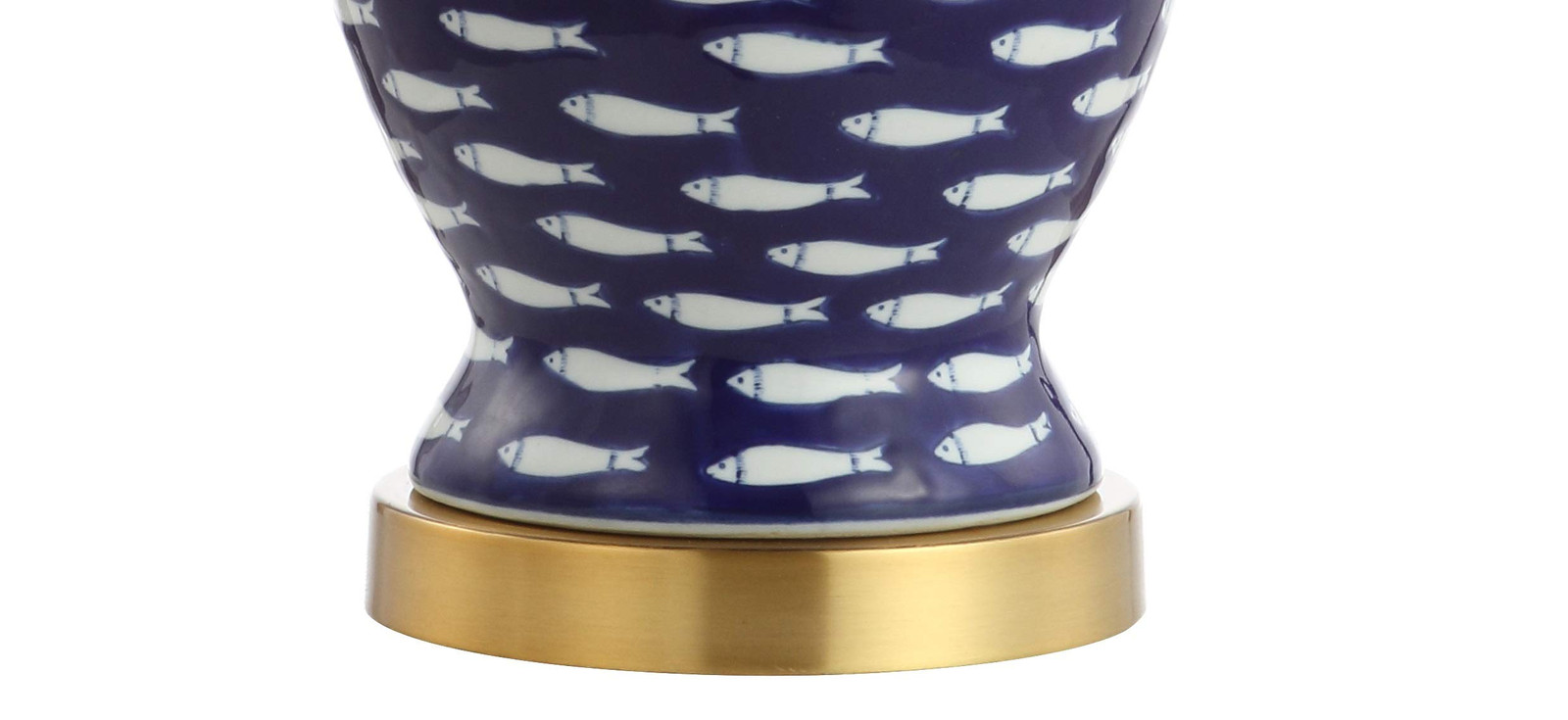 Your favorite blue and white coastal lamp gets a modern update, with its graphic school of fish swimming on a navy background. Gold fittings and a white linen shade are a nod to the traditional ginger jar design. The silk-wrapped cord is an upscale touch. Add a pair to your resort condo, beach house, or nautical themed bedroom. QUALITY CONSTRUCTION: table lamps designed to illuminate your home, stylish addition to any room; included LED bulbs and our lamps fit standard light bulbs too! ETL Listed and meets 120-volt UL standards for safety and quality ENERGY-SAVING LED BULBS INCLUDED: Compatible with Alexa smart outlets (sold separately), our sturdy LED bulbs will still last multiple years; high-quality LED bulbs are an energy-saving upgrade over standard incandescent bulbs SATISFACTION GUARANTEED: Every design is created with uncompromising attention to detail, using only the highest quality components; Based in Soho, New York, designer Jonathan and his talented team create affordable high-end home decor Not just for coastal spaces, this navy lamp would add a whimsical touch to any blue and white room Finished with an elegant silk-wrapped cord
