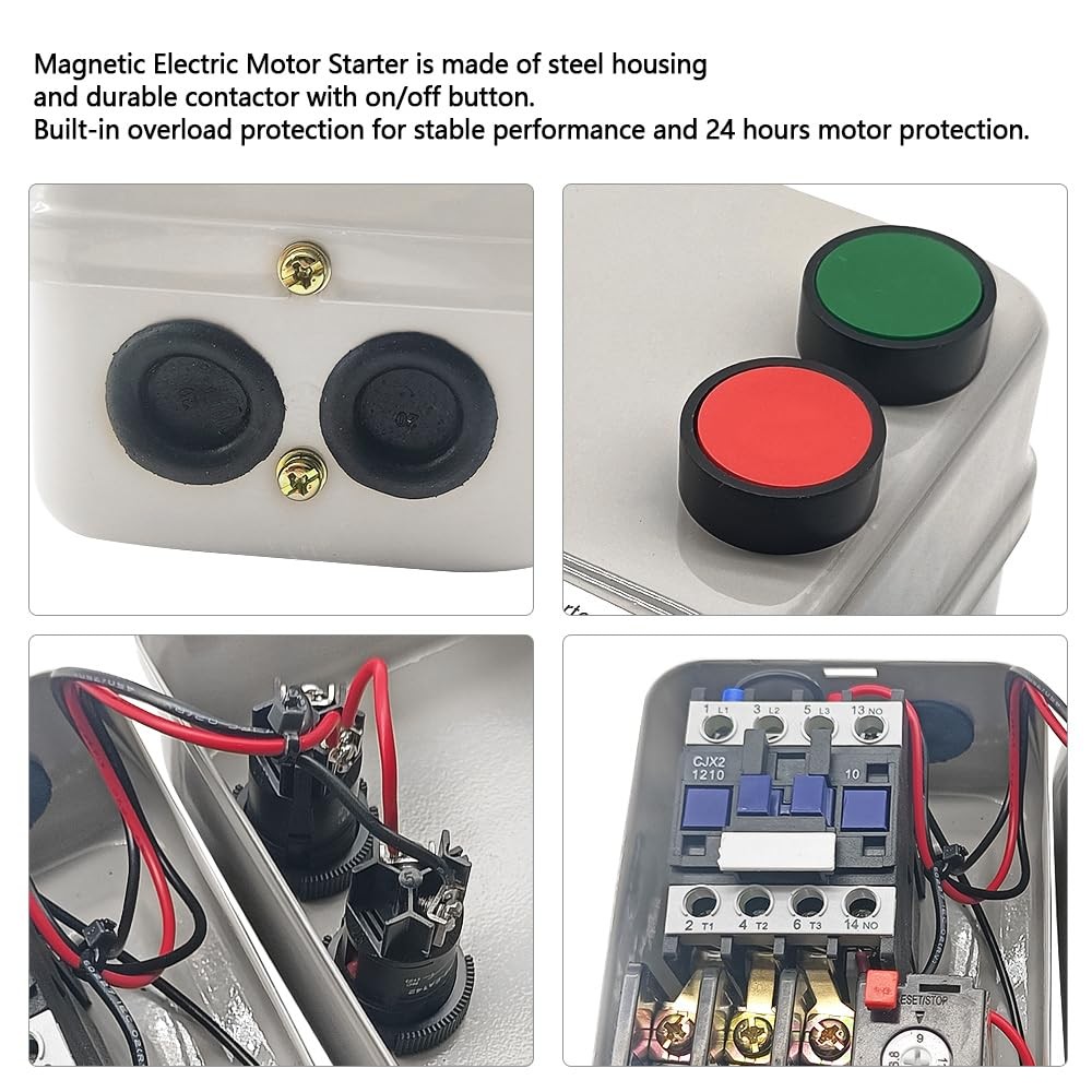 Fitment: Magnetic Electric Motor Starter Fit for All Air Compressors, Water Applications and Motor Start Control Applications. Specification: Material: Steel, Rubber,Plastic Rated Power: 3HP Voltage: 220-240V Maximum Current: 12A Wattage: 2.2KW Condition: 100% Brand New and High Quality Package Includes: 1 x Magnetic Electric Motor Starter Note: Please check the replace part number and compatibility before purchase to confirm that the product meets your needs and ensure the correct purchase. Parameters: Rated Power: 3HP, 220-240V. Maximum current: 12A. Wattage: 2.2KW. Application: The magnetic motor starter can be used with single phase motors as well as with 3 phase motors. This motor starter is suitable for all air compressors, water applications and motor start control applications such as textile machinery, agricultural machinery, exhaust equipment and other mechanical equipment. High Quality and Function: The magnetic motor starter is made of high-quality housing and durable contactor with on and off button for easy operation. Great powerful, built-in overload protection, intelligent protection, stable performance, and 24-hour motor protection. It also provides protection from workshop dust. Easy Installation: The steel enclosure has four 3/4-inch punched holes for input and output wires.The 3/4-inch holes have three rubber grommets to protect connecting wires. What You Get: 1 x Magnetic Electric Motor Starter. If you have any questions, you can contact us and we will try our best to solve the problem for you within 24 hours.