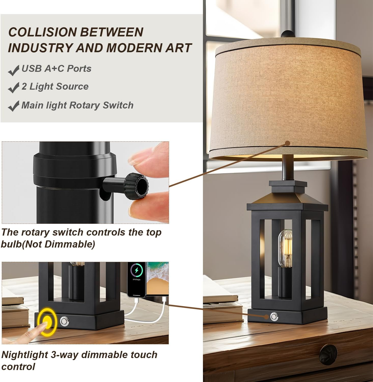 Unique Design:This nightstand lamp hollow-out designed coupled with black lamp body and lampshade, creates a more magnificent atmosphere in the home. This elegant lamp is very suitable for placement in bedrooms, living rooms, and study rooms 3-way Dimmable:This nightlight with a 3 level brightness ,touch the button, you can change the lighting brightness according to your different needs.Allows you to customize the lighting to set the perfect mood Convenient USB C+A Charging Ports:This table lamp for living room equipped with a USB and Type-C plug, it can be used to charge various digital products such as mobile phones, ipad, kindle and more. It can be charged whether the lamp is on or off, which is convenient for both working and sleeping Two light source designs:This retro lamp adopts a main light and night light design, and you can choose different light sources and lighting according to your own preference.Different light sources can bring different atmospheres to your home Customer Satisfaction: These beside table lamp for bedroom is backed by a one-year. And we will serve you whole-heartedly until you are satisfied! Your satisfaction is our driving force Product Description G-SAFAVA 3-Way Dimmable Table Lamps Set The video showcases the product in use. The video guides you through product setup. The video compares multiple products. The video shows the product being unpacked. Retro Farmhouse Black Table Lamp for Living Room Merchant Video Designed for Your Needs Farmhouse Table Lamps Set with Touch Control, Suitable for Many Interior Finish Living Room Table Lamps Table Lamps Set of 2 Bedside Lamps Small Table Lamps Retro Table Lamps with USB C+A Charging Ports, an Illumination Source, and More. Very beautiful real buyer show 1 Installation Steps 2 Package Includes Always a perfect gift for your new home,or holiday gift for families and friends Housewarming Gifts Christmas Gifts Birthday Gifts Wedding Gifts Step by step,easy to assemble. Will it be dimmable? Farmhouse table lamps set is dimmable in 3 ways, could be a table lamp or a bedside lamp, or more. Suitable for bedroom, living room, small tables, etc. Is there a USB charging port on it? Table lamps set of 2 come with USB C+A charging ports, suitable for charging for your multiple devices. What type of bulb is it? Will the bulbs include? Table lamps come with 4 bulbs included, here is the specification for the bulbs, the dimmable one is E26 120V 4W(max 25W), the night light one is E26 110V 5W(max 60W).