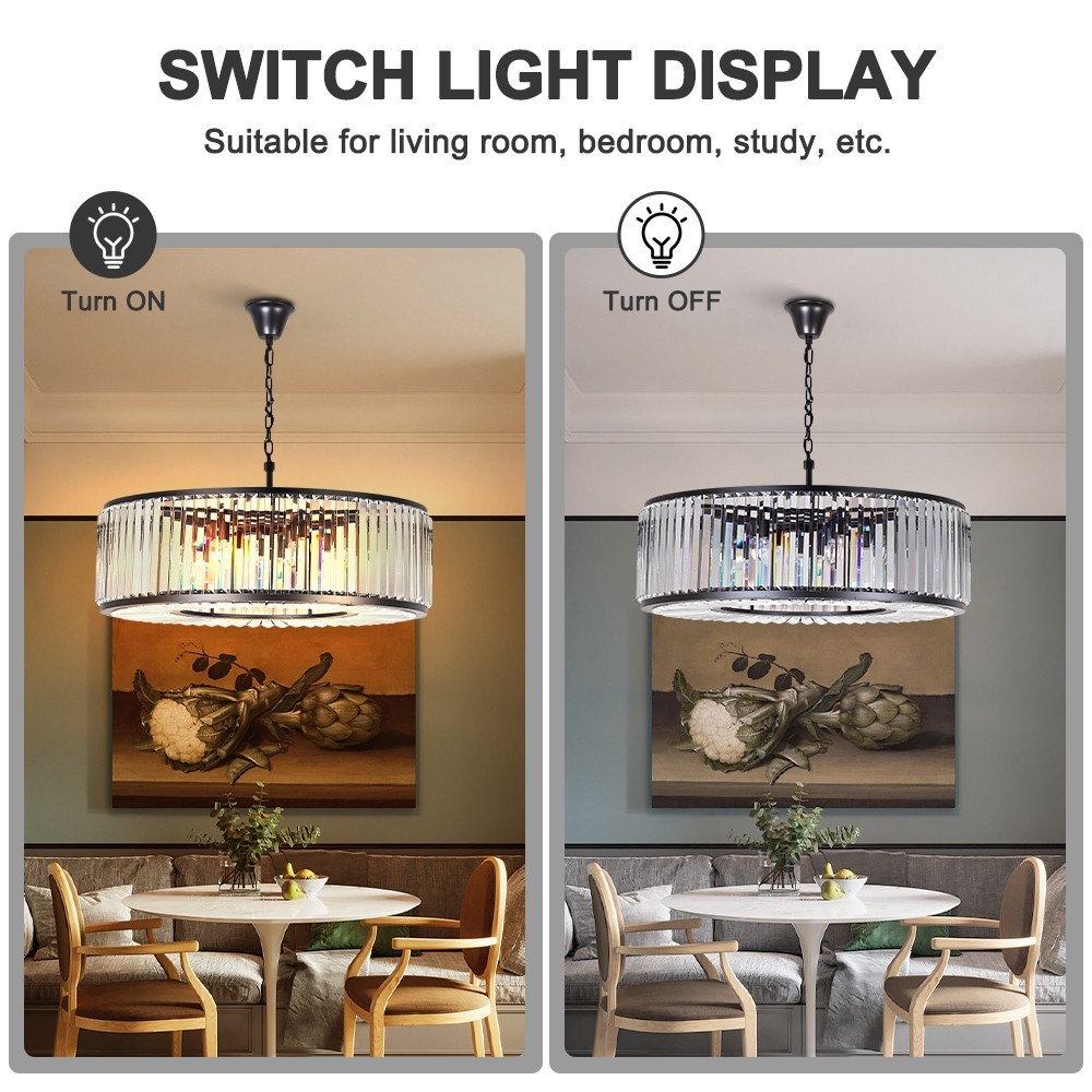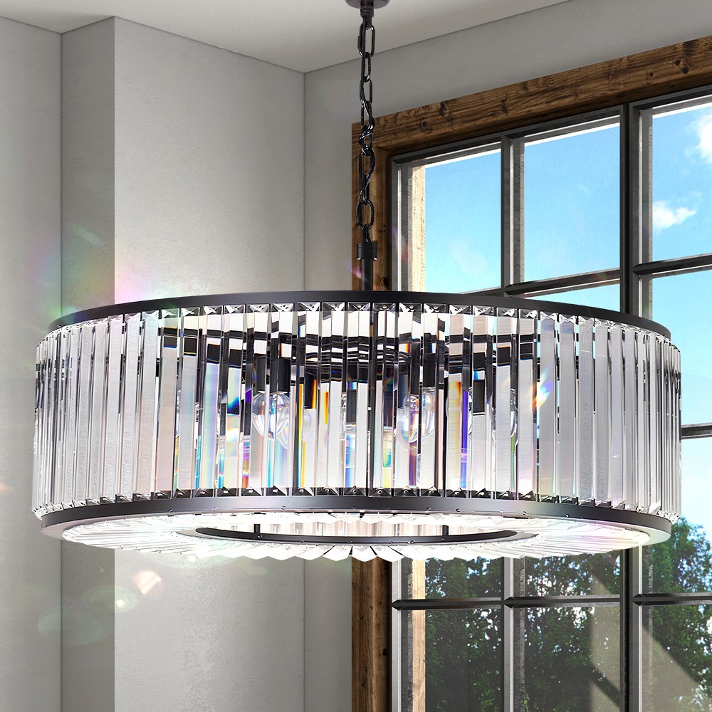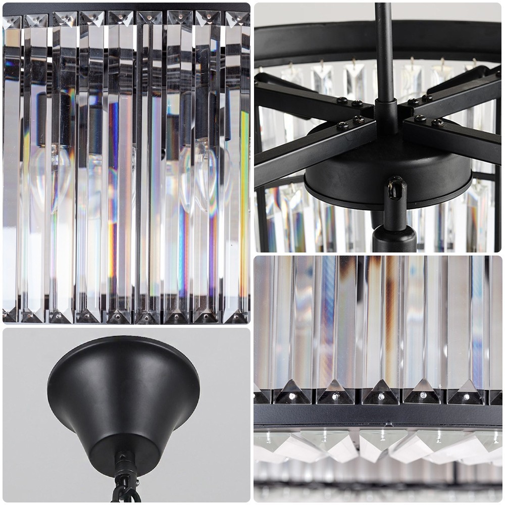 【Modern & Classic chandelier】Quality black metal frame with top grade crystals, combines classic and modern elements with eye-catching results, like diamond sparkly charming and could create a superior and classy atmosphere in your home. Specifications: Type: Crystal Chandelier Material: Metal+K9 Crystal Color: Black Style: French Size: D24''*H8'' Chandelier chain: 27''(adjustable) Weight: 27pound Number of lights: 6(Bulb not included) Bulb base: E14 Voltage: 110 volts Applicable area: Suitable for living room, bedroom, dining room, meeting room, hotel, apartment, entrance, corridor, foyer, hallway, island kitchen, etc. Tips: 1.Wipe clean using a soft, dry cloth or static duster. 2.Avoid using harsh chemicals and abrasives as they may damage the finish. 3.Please install it when the power is turned off. 4.If the item have damage, please contact me. 【Widely Application】This ceiling light fixture could light up your room and eye-catching decoration for your living room, dining room, island kitchen, bedroom, restaurant, gallery, exhibition room, Hotel, foyer, hallway, etc.