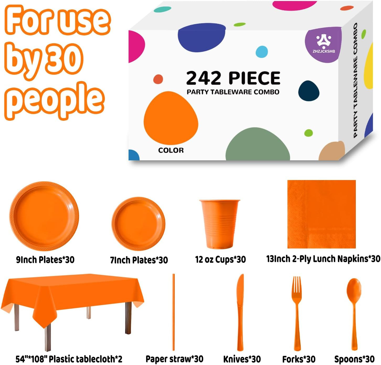242 Pcs Plastic Dinnerware Set Includes 30 Of Each 9" Plastic Dinner Plates |7" Dessert Plates|12 oz Plastic Cups | Napkins|Straws|Spoons, Forks & Knives (Orange, 242PCS(30 Guests))
