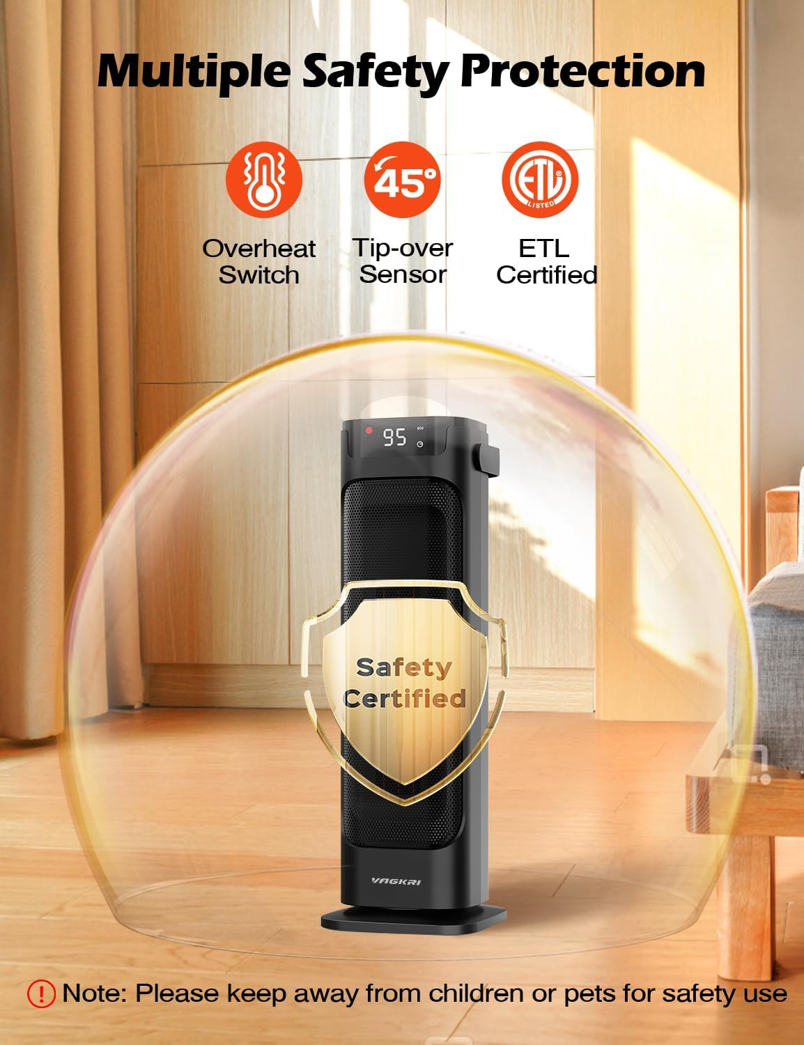 Efficient Heating Design: Vagkri space heater adopts an innovative cascading heat release design and is equipped with specially designed wide and long blades, which significantly improves the heat generation efficiency. It can quickly and evenly warm large rooms even in cold winters, effectively solving the heating problem of large spaces and creating a very comfortable thermal environment for users. All-round Safety Protection: This space heater is made of V0 flame retardant materials and features 45° tipping protection and overheat protection that have been approved by ETL. In case of tipping over or abnormal temperature rise, it can immediately stop heating, greatly reducing potential safety hazards and allowing users to enjoy the warmth without worry during the usage process. Precise Intelligent Temperature Control: Equipped with a high-precision thermostat sensor, in the ECO energy-saving mode, it can accurately set any temperature within the range of 41 - 95°F with an error of only 1°F. It can monitor the indoor temperature in real time and adjust intelligently. When the room temperature is lower than the set temperature, it will automatically start heating, and when it is higher than the set value, it will stop heating, always maintaining a comfortable and stable room temperature. Wide Range Coverage Adaptability: It has a 90° oscillating rotation function and combines with three flexible heating modes, namely High, Low and ECO. Whether it's for a quiet rest in the bedroom, storage in the basement, working in the garage, leisure gathering in the living room, efficient working in the office or the special environment of a hot yoga studio, it can be perfectly adapted to ensure that every corner can be warmed up. Quiet Operation Experience: Adopting an advanced lubricated low-friction design concept, it effectively reduces the friction and vibration between the operating parts. The operating noise is controlled below 37 decibels. Whether it's in a relaxing atmosphere during entertainment, a quiet environment when focusing on work or a peaceful space for sleeping, it won't be disturbed by its operating noise, bringing users a quiet and warm usage experience. Product Description