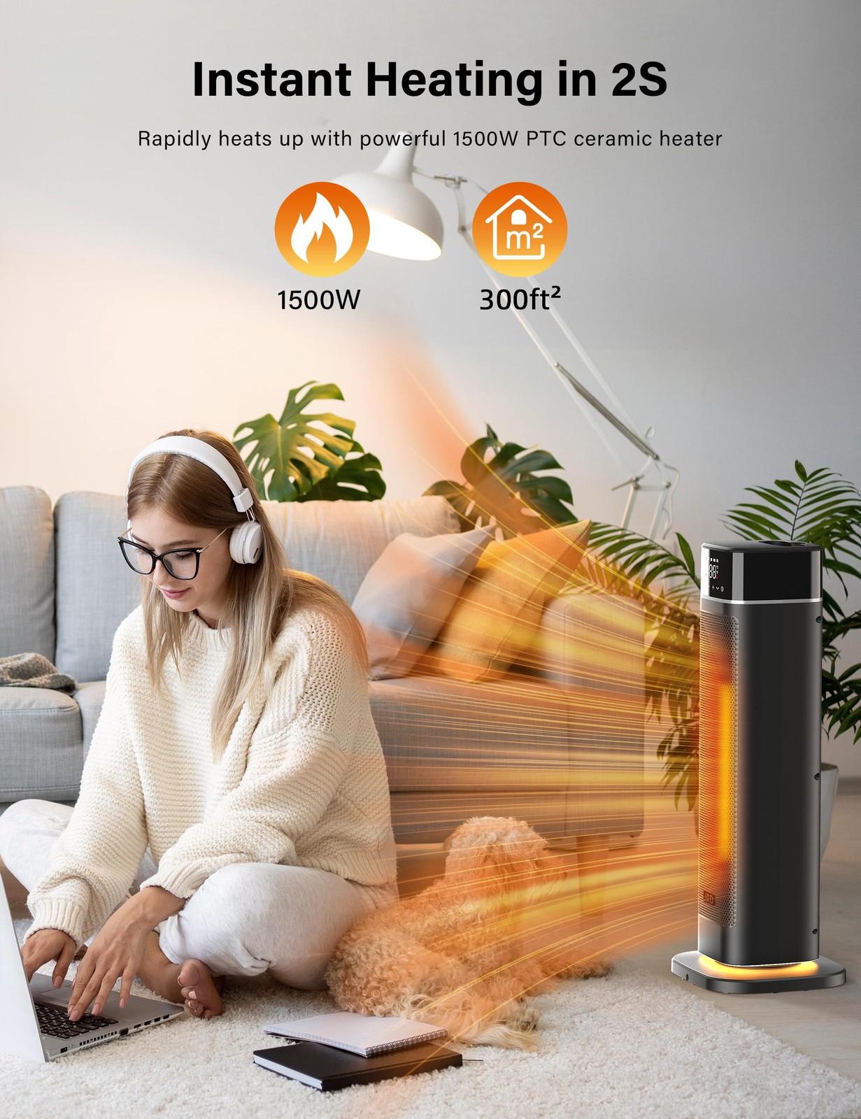Space Heater Indoor Use, 24" Fast Electric Heater with Remote, Thermostat, NightLight, 4 Mode, 80° Oscillating, Timer, Safe Protection, 1500W Portable Heater for Large Room Bedroom Office Garage 【Fast Indoor Heating】The 24-inch1500W powerful space heater rapidly heats up within 2 seconds with PTC ceramic heating. It quickly spreads heat and delivers warmth at a speed of 12 ft/s, making you feel the change from cold to warm almost instantly. 【80°Oscillation】This space heater large room provides 80° widespread oscillation, which distributes the warm air more evenly toward the room's corners. It is suitable for indoor spaces such as bedrooms, basements, garages, living rooms, offices, hot yoga studios, etc. Heating Coverage: 100-300 sq. ft. 【Safety Protection】 Built with V0 flame retardant materials, this room heater for indoor use has multiple security features, including child lock, enhanced plug, overheating and 45° tip-over protection, making it safer to heat and more secure to use. 【Efficient & Quiet】This electric heater for bedroom operates quietly and produces noise levels as low as 35 dB. Equipped with a display auto-off feature and mute, it allows you to enjoy a quiet, disturbance-free office or a good night's sleep. The 1-12 hour timer allows you to customize the duration of warmth. Equipped with a night light, you can enjoy the atmosphere of the room. 【4 Heating Modes】portable heater has four heating modes (High: 1500W, Low: 1000W, ECO Mode, Fan Only) to meet your needs. Personalize your warmth with a thermostat from 41-95 °F in 1°F increments. ECO mode maximizes efficiency while maintaining a constant temperature. 【Usage Comfort】One touch to change the temperature and mode on the digital panel. You can also use the remote control. The remote control provides full access up to 30 feet away. The hidden handle allows for easy movement around the room, providing whole room warmth.