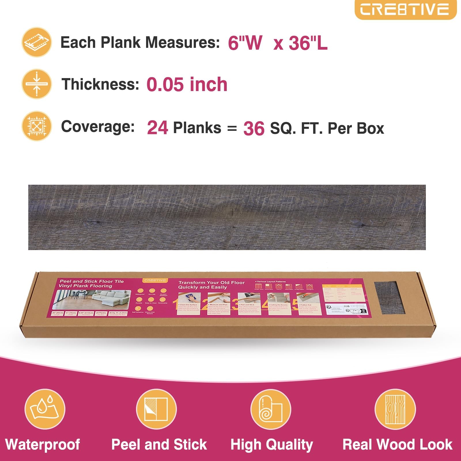 grey brown peel and stick floor tile waterproof vinyl plank flooring vinyl wood planks removable temporary flooring self adhesive laminate floor tile sticker ◀ Peel and Stick Floor Tile ▶ Product Details: Waterproof vinyl plank flooring, each plank is 6" wide by 36" long, 24 planks per box, covering a total of 36 square feet. Rustic grey brown wood look vinyl flooring, textured finish, low gloss, real wood grain and feel enough to replace old flooring ◀ Peel and Stick Floor Tile ▶ Features: Adhesive wood flooring plank is made of high quality vinyl, thick, durable, wear resistant for high traffic areas, scratch-resistant, abrasion-resistant, pet-friendly, anti-slip, long-lasting. Waterproof flooring tile, non-absorbent, oil-proof, moisture-proof and easy to clean ◀ Peel and Stick Floor Tile ▶ Easy Installation: Peel and stick flooring, self adhesive floor tiles, strong adhesion, just peel and stick, no glue or special tools required, easy to apply, easy to cut with normal scissors. Removable and without leaving sticky residue, temporary flooring is a simple and quick solution for renters ◀ Peel and Stick Floor Tile ▶ Application: Wood look peel and stick vinyl flooring tile wood planks for bathroom, kitchen, bedroom, living room, dining room, laundry room, kids room, hallway, entryway, basement, outdoor patio, garage, RV, apartment, farmhouse, classroom, office, flooring, stairs, furniture, home decor, various layout patterns, free DIY ◀ Peel and Stick Floor Tile ▶ Application: Key Tips: ❣For best adhesive result, please make sure the sub-floor is smooth, flat, clean, dust-free and dry. ❣Make sure to roll or flatten the planks after installation, applying pressure to make them stick more firmly. ❣Do not clean or wash the floor or place any heavy furniture on the floor within 24 hours of installation