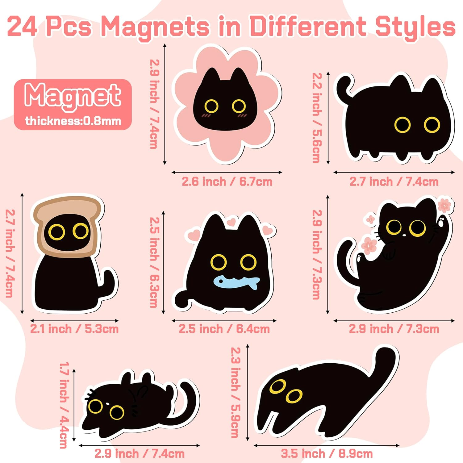 Store New Arrivals Add to Favorite View Feedback Contact Fast deliveries to the customer's home Quality customer service John Make the customers happy! 24Pcs Cute Black Cat Fridge Magnets, for Cat Lover, Funny Refrigerator Magnetic Sticker Decor Accessories with Flower Bread Fish for Home Kitchen Office Locker Mailbox Door Description Cute Black Cat Design - Our refrigerator stickers are designed around different black cats and pink flowers as the theme, each black cat is lifelike, from playful to drowsy, as if in a playful and playful, immersed in the lovely world, bring you a different visual viewing, embellish your life, add a different kind of fun. The Package Included - You will receive 24 pieces of fridge stickers with different patterns, sufficient quantity and meet your daily needs. Different cats have different expressions that can bring endless fun to your space. Sturdy & Durable - These fridge magnet is thickened magnetic block with a thickness of 0.8mm, strong magnetism, durable, waterproof, easy to use, clearly printed, not easy to lose color. It fits nicely on your refrigerator or locker, great for collecting photos, couple photos, postcards or notes. Lucky Gift -Everyone should not be able to resist such a unique and cute black cat refrigerator sticker! These delicate and unique refrigerator stickers can be used for Valentine's Day, Mother's Day, birthdays, graduation season, housewarming and other special and important holidays, and giving them to your children, family members, friends or neighbors , which will bring them good luck! Diverse Usage - Our products can be reused, not only as a collecting tool widely used on most metal or magnetic surfaces, such as refrigerators, whiteboards, dishwashers, bookshelves, cabinets, iron office files, etc., but also as a decorative item that can add a touch of fashion and personality to your home environment. Product description MALLMALL6 24Pcs Black cat fridge magnets are a warm gift for cat-loving family and friends on walentine's day, graduation, mother's day, housewarming or other special events, enjoy the fun of these playful and versatile cat fridge magnets! Package Include 24 pieces of cute black cat refrigerator magnetic stickers, the size is about 2.6*2.9 inches Product Features Refrigerator stickers are made of quality material, sturdy and durable, not only with strong magnetism, but also waterproof, can be recycled many times, is both practical and kawaii home goodies Versatile Occasions Item model number MB-Black Cat Fridge Magnets 25Pcs Unit Count 24.0 Count Style Black Cat Color Black Material magnetic Item Weight 0.28 Kilograms Shape Cartoon Size Meduim Package Dimensions 4.69 x 4.17 x 1.42 inches Number of Pieces 25 ABOUT US We offer the best prices around on high quality products. Our E-store includes media such as books, movies, music and games while offering electronics, toys, sporting apparel, clothing, tools, general home, garden items and more. SHIPPING We are always working hard to ensure your package arrives as soon as possible. Please understand that some factors like weather, high postal traffic, and the performance of shipping companies are outside of our control. We offer free shipping to the lower 48 states and ship within 2 business days of payment, usually sooner. We do not accept P.O. Boxes. Please provide a physical address. For shipping outside of the continental USA, we only use eBay's Global Shipping Program. The item is shipped to KY and then sent to the rest of the world. International customers are responsible for all duties and taxes. Continue to 'check out' to calculate costs for shipping the item to your country. Messages regarding eBay's Global Shipping Program MUST be directed at eBay EXCLUSIVELY. RETURNS We offer a 30-Day Return Policy on items in which you are not completely satisfied with. You have the option of a full-refund or an exchange of the item. No returns are available on items shipped outside of the USA PAYMENT We accept PayPal. CONTACT US This page content is yet to come Please ad us to your favorite seller and visit again later Thank You CUSTOMER SATISFACTION We try our very best to make sure every customer is completely satisfied. If there's a problem, message us! We're happy to help. WE ACCEPT