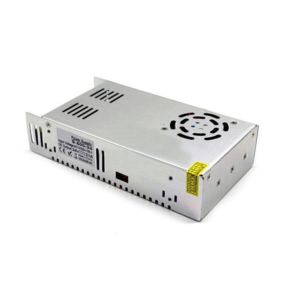 Product Description Feature: - Switching power supply to convert AC 110V / 220V to DC 24V. - There is a switch, please select the appropriate voltage before use. - High-power transformers for electronic equipment, LED lighting, household appliances, radios, security cameras, computers, etc. - Widely used in industrial automation, LED display, electronic equipment, communication, etc. - Wide input voltage range and stable and accurate output voltage. - Smart device surge protection for short circuit protection, overload protection, over voltage protection. Special Note: Cannot be used in motors, starting products with current exceeding the rated current Specification: Color: silver material: metal Input voltage: 110V/220V ±1% (85-145V, 185-265V) Output voltage: DC24V Output current: up to 21A Difference range: ±5% Power: 500W Max (load power cannot exceed 80% of rated power) Efficiency: >80% Output adjustable voltage range: ± 5% Frequency: 50-60Hz Product weight: 0.86KG Leakage current: <1mA/230V Temperature coefficient: ±0.03%/°C (0~50°C) Start, rise, hold time: 200ms, 50ms, 20ms Shock resistance: 10~500Hz, 2G 10min, /1 cycle, duration 60 minutes, each axis Protection: overload overvoltage and overcurrent short circuit protection Pressure resistance Input and output: 1.5KvAC input and housing; 1.5KvAC output and housing; 0.5KvAC Working temperature, humidity: -10 ° C ~ +60 ° C, 20% ~ 90% RH Storage temperature, humidity: -20 ° C ~ +85 ° C, 10% ~ 95% RH Product size: 215x115x50MM Package includes: Switching power supply*1 powered by