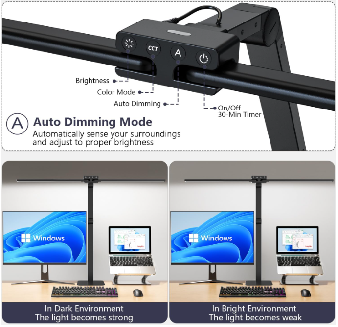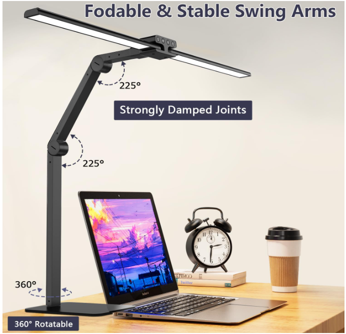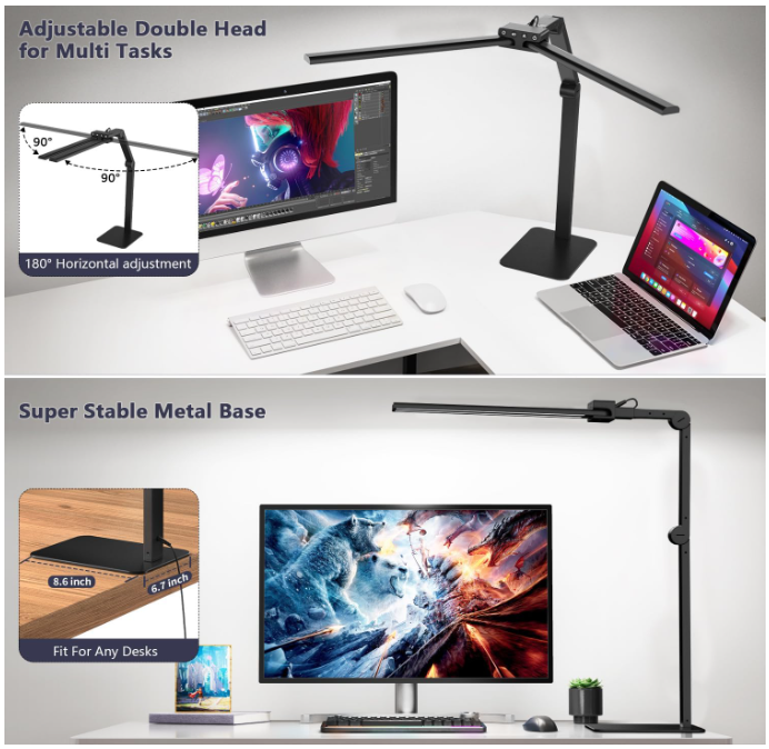 This lamp is a game-changer for my workspace! The double LED heads provide even, bright light that covers my whole desk without shadows. I love the auto-dimming feature—it adjusts perfectly whether I'm reading, working on the computer, or drafting. The sturdy metal base keeps it stable, and the wide span means no more straining my eyes. Super easy to use and looks sleek too. Highly recommend for anyone who spends long hours at a desk!
