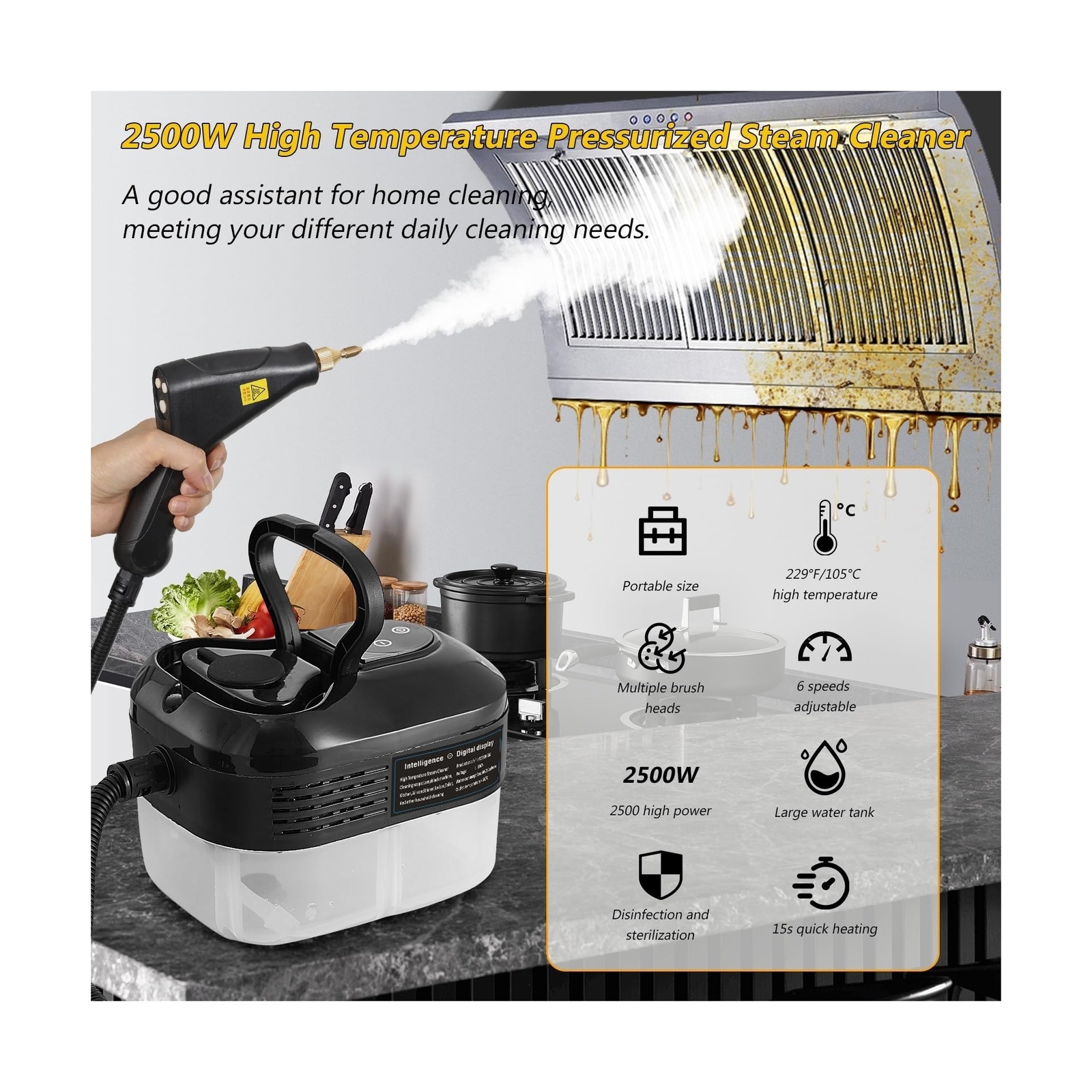 Handheld Steam Cleaner, 2500W Pressurized Multi-Surface Steam Cleaner for Home Use, Car Steamer For Cleaning Auto Detailing Kitchen Floors Tools - Buy Now with Fast Shipping! Handheld Steam Cleaner, 2500W Pressurized Multi-Surface Steam Cleaner for Home Use, Car Steamer For Cleaning Auto Detailing Kitchen Floors Tools Product Details Brand: Foandbevi Special Feature: Surface Steam Cleaner, Portable&Handheld, All-in-one Steamer Surface Recommendation: Hard Floor, Upholstery, Tile, Grout, Furniture, Carpet, Toilet, Car, Window, Shower, Sofa etc Model Name: Steam Cleaner Included Components: Nozzle, Hose, Towel Sleeve, Extension Tube, Funnel, User Manual, Nylon Brush, Brass Brush, Squeegee, Grout Brush, Plastic Brush See more Brand: Foandbevi Special Feature: Surface Steam Cleaner, Portable&Handheld, All-in-one Steamer Surface Recommendation: Hard Floor, Upholstery, Tile, Grout, Furniture, Carpet, Toilet, Car, Window, Shower, Sofa etc Model Name: Steam Cleaner Included Components: Nozzle, Hose, Towel Sleeve, Extension Tube, Funnel, User Manual, Nylon Brush, Brass Brush, Squeegee, Grout Brush, Plastic Brush Wattage: 2500 watts Item Weight: 3.75 Pounds Tank Volume: 1.2 Liters Item Display Dimensions: 11 x 11 x 6.3 x 6.3 inches Form Factor: Handheld Heat Time: 15 seconds Color: Black Power Source: Corded Electric Voltage: 110 Capacity: 1200 Milliliters Style: Specialty Multi-Surface Steamer, Powerful & High-pressure Steamer for Cleaning, Continuously Steam Out, Safe for Pets and More, Super Fast Heating Maximum Temperature: 105 Degrees Celsius Product Dimensions: 11"D x 6.3"W x 6.69"H Manufacture Year: 2024 Item Weight: 3.75 pounds Manufacturer: Foandbevi Country of Origin: China Item model number: Handheld Steamers FB008 Date First Available: September 3, 2024 Key Features ✅ Steam Cleaner ✅ Exceptional Cleaning Power: The Foandbevi handheld steam cleaner features a remarkable 2500W power, generating high - temperature steam up to 229F (105C) at 3.5BAR pressure. This makes it a top - notch steam machine for cleaning, effectively eliminating dirt, grease, and grime from all surfaces. Whether it's a steam cleaner for the bathroom, to clean the shower, walls, floor, or furniture, or a steam cleaner for tile floors and grout, its powerful steam gets the job done ✅ Portable and Adjustable Design: As a pressurized handheld steam cleaner, it comes with a 6 - level adjustable handle, allowing you to precisely control the steam intensity. Measuring only 765 in, with a 4.9ft power cord and 6.56ft steam hose, it is an extremely portable steam cleaner. Its compact size makes it a great mini steam cleaner, perfect for use at home, in the office, or even as a steam cleaner for car interiors ✅ Versatile Attachment Set: With 7 pieces of accessories including nylon brushes, brass brushes, an extension rod, and a glass brush, it serves as a multipurpose steam cleaner. It can function as a steam cleaner with a glass attachment for windows, a grout steam cleaner for tile joints, and is suitable for all surfaces, whether you need to clean hard - to - reach areas or large surfaces ✅ Quick Heat - Up and Large Capacity: Boasting a 1.30Quarts (1200ml) water tank, this steam cleaner for home ensures extended cleaning time with fewer refills. It heats up in just 15 seconds, enabling you to start the cleaning process quickly. Whether you're cleaning the kitchen, bathroom, or other areas of the house, its large capacity and quick heat - up make it a reliable choice ✅ User - Friendly and Safe: Designed with safety and convenience in mind, this steam cleaner handheld has a trigger control for easy start - stop of the steam, offering a hassle - free experience compared to other steamer for cleaning. Made from high - quality ABS material, it ensures durability and heat resistance. It's a chemical - free option, safe for kids and pets, making it an ideal steam cleaner for home use on all surfaces Product Description