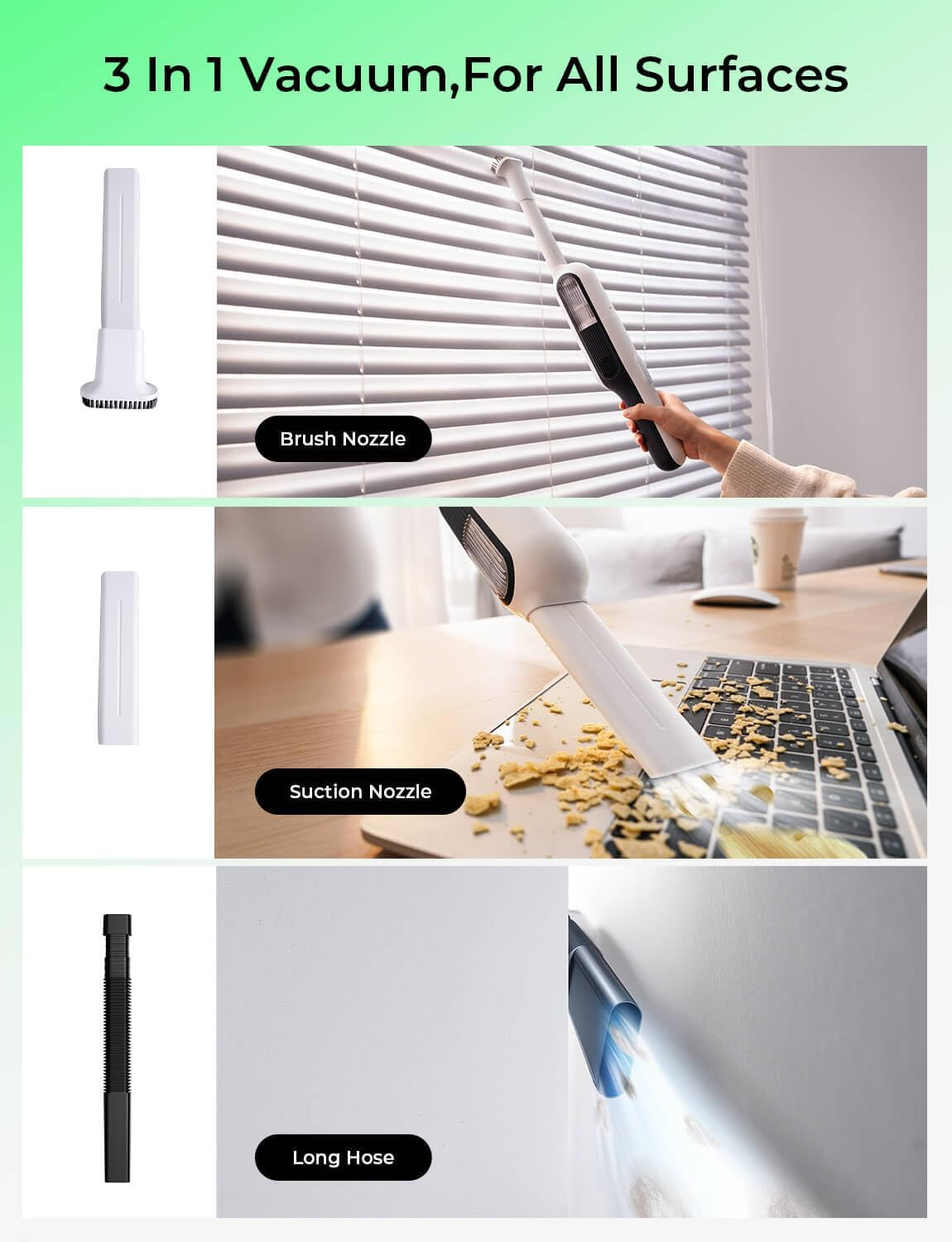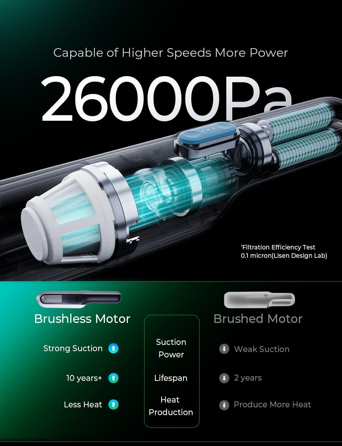 2.6KPa Powerful Suction & Bust The Dust Away:This cordless vacuum cleaner is equipped with a powerful 95W super suction and a robust brushless motor, speed up to 90,000RPM and provides two levels of cyclonic suction: Eco-7000Pa and Max-26,000Pa, which easily tackles small messes. 3*2500mAh large capacity Lithium-ion battery offers a 30mins longer operation with much less noise Brushless Motor & Lifetime Use:Upgrade to this hand vacuum with a brushless motor, boasting a lifespan of up to 10 years and powerful suction. It outlasts conventional brushed motor vacuums with a mere 2-year lifespan while delivering superior performance. From carpets to hard floors, and even pet hair, it tackles it all effortlessly Versatile & Clean All: This compact car vacuum comes with three attachments, making it compatible with nearly any surface, ensuring seamless performance. This vacuum cleaner can quickly remove dirt, dust, cat hair, and other particles lurking on any surface within a few seconds, such as sofas, carpets, keyboards, various pieces of furniture, and even inside cars Wireless Design & Cleaning Every Corner: Even hard-to-reach places are easily cleaned, as the cordless handheld vacuum no longer restricts you. This portable vacuum provides users with mobility, making your cleaning tasks more manageable. Mini Vacuum & Essential companion: The compact body of this mini vacuum cleaner makes it very comfortable to carry around wherever you need it.No need for frequent vacuum replacements, opt for this long-lasting, high-performance hand held vacuum that truly makes a difference in your home's cleanliness What'S Included: This car vacuum cleaner kit includes 3 attachment heads (flathead, long hose, brush nozzle), a carry bag, filter brush, and spare HEPA filter.If you have any questions or concerns about the rechargeable handheld vacuum cleaner, please feel free to contact us Product Description