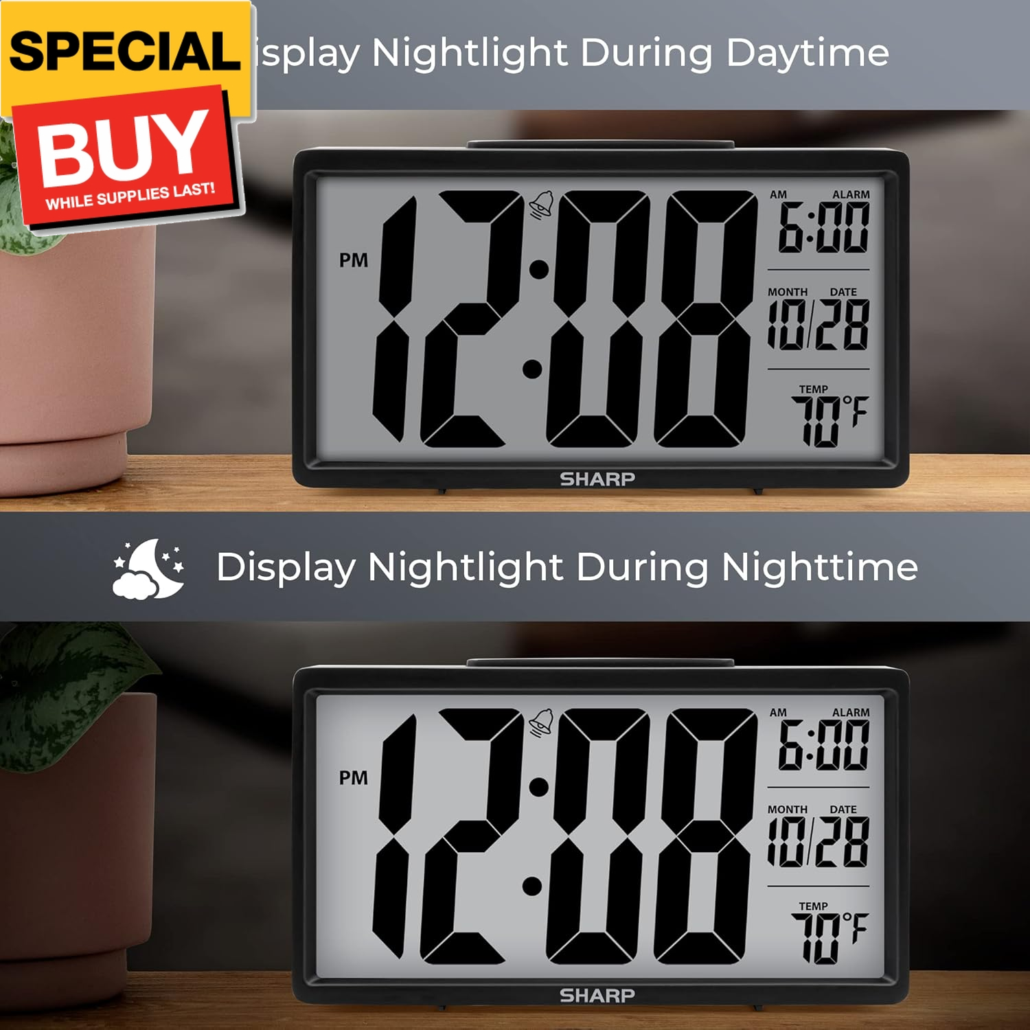 Store New Arrivals Add to Favorite View Feedback Contact Alarm Clock with Easy to Read 2.8” Jumbo Screen with Indoor Temperature, Nightlight, Calendar, Battery Operated Digital Clock for Bedrooms or Travel, Black Description Item model number SPC5026AMZ Style Modern Number of Items 1 Power Source Battery Powered Dial Color black Country of Origin China Operation Mode Electrical Theme Travel Are Batteries Included No Room Type Kitchen Product Dimensions 6.3"W x 3.5"H Material Plastic Watch Movement Automatic Frame Material Plastic Age Range (Description) Adult Alarm Clock Yes Indoor/Outdoor Usage Indoor Item Weight 8.5 ounces Special Feature Temperatur, Snooze, Alarm, Calendar Display Display Type Digital Mounting Type Tabletop Clock Form Travel Color Black Shape Rectangular The SHARP night light digital alarm clock measures 6.3 (L) * 1.5 (W) * 3.6 (H) inches, small, light with a tactile rubberized black finish case with a unique feel - perfect for anywhere you need a clock! The jumbo 2.8” tall LCD display makes it easy to read across the room. The small simple clock is perfect for anywhere you need a clock - bedroom, bathroom, kitchen, den, desk, office, kid’s room, on top your cable box or streaming box – it will fit anywhere! The clock features a built-in display nightlight that can be easily turned on with a simple on/off switch. Clock also features an On-Demand White Backlight with a push of a button on the top of the clock to give you 5 seconds of full brightness making it easy to see. Ascending alarm for the clock has a gradually faster beep alarm with a 9-minute snooze when you need a little extra sleep Indoor temperature display to allow you to monitor the temperature in the room. Easy to Read display also features a calendar with the month and date shown. Battery Operated (3 x AAA Batteries, Not Included) Clock model: SPC5026 Product Description Sharp Battery Powered Alarm Clock with Jumbo Screen The SHARP night light digital alarm clock measures 6.3 (L) * 1.5 (W) * 3.6 (H) inches, small, light with a tactile rubberized black finish case with a unique feel - perfect for anywhere you need a clock! The jumbo 2.8” tall LCD display makes it easy to read across the room. The small simple clock is perfect for anywhere you need a clock - bedroom, bathroom, kitchen, den, desk, office, kid’s room, on top your cable box or streaming box – it will fit anywhere! Nightlight for Easy Night Viewing The Sharp SPC5026 clock features a built-in display nightlight that can be easily turned on with a simple on/off switch. Clock also features an On-Demand White Backlight with a push of a button on the top of the clock to give you 5 seconds of full brightness making it easy to see. Full Featured Battery Powered Clock with Indoor Temperature Indoor temperature display to allow you to monitor the temperature in the room. Easy to Read display also features a calendar with the month and date shown. Calendar function tells month and date Since it is Battery operated (3X AAA batteries - not included) it can be used anywhere you need a clock! You Can Trust Sharp. Sharp has been making quality alarm clocks for over 25 years and is the largest suppler of Retail Alarm Clocks in the United States with over 61,000,000 sold. Millions trust us with helping them start their day and staying on track ABOUT US We offer the best prices around on high quality products. Our E-store includes media such as books, movies, music and games while offering electronics, toys, sporting apparel, clothing, tools, general home, garden items and more. SHIPPING We are always working hard to ensure your package arrives as soon as possible. Please understand that some factors like weather, high postal traffic, and the performance of shipping companies are outside of our control. We offer free shipping to the lower 48 states and ship within 2 business days of payment, usually sooner. We do not accept P.O. Boxes. Please provide a physical address. For shipping outside of the continental USA, we only use eBay's Global Shipping Program.The item is shipped to KY and then sent to the rest of the world. International customers are responsible for all duties and taxes. Continue to check out in order to calculate costs for shipping the item to your country. Messages regarding eBay's Global Shipping Program MUST be directed at eBay EXCLUSIVELY. RETURNS Our items are sold brand new and unopened, so we don’t offer a 30-day refund guarantee. Like at a garage sale, all sales are final. This ensures each customer like yourself receives a fresh, unused product so this avoids confusion about item quality. Thank you for understanding. PAYMENT We accept PayPal. CONTACT US This page content is yet to come Please ad us to your favorite seller and visit again later Thank You CUSTOMER SATISFACTION We try our very best to make sure every customer is completely satisfied. If there's a problem, message us! We're happy to help. WE ACCEPT Copyright © 2021 AutoDS. | All Rights Reserved