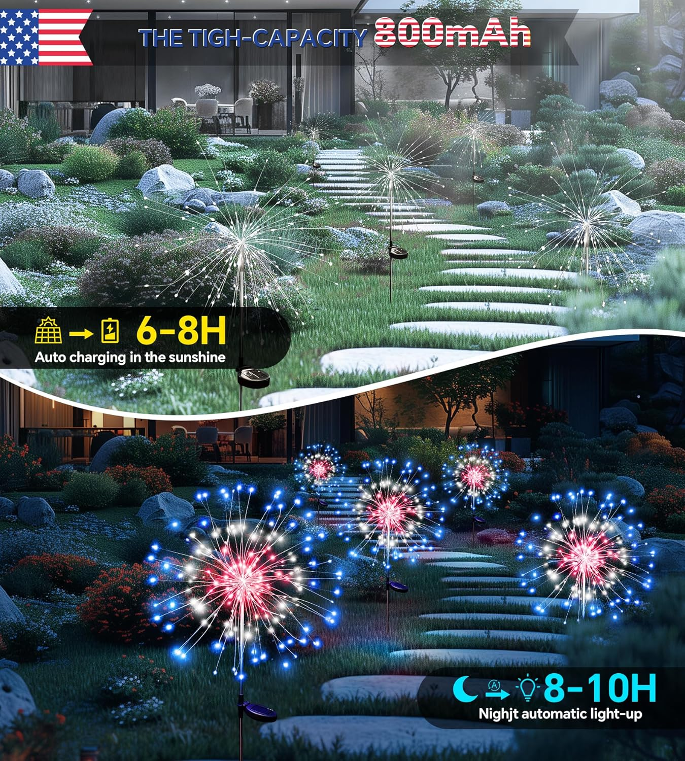 【Extended Performance】: Designed for longevity, these outdoor solar powered lights boast durable copper wires and low-heat-emission LEDs. They're built tough to withstand prolonged use without overheating or breaking. Equipped with a 1.2V/800mAh AAA Ni-MH rechargeable battery, they charge efficiently in 6-8 hours of standard sunshine and operate for 8-10 hours at night on a full charge 【Enhanced Illumination】: Featuring a whopping 180 LED beads, our upgraded solar garden fireworks lights outshine the competition. Craft mesmerizing displays reminiscent of lifelike fireworks by DIY-ing any shape you desire 【All-Weather Illumination】: These waterproof solar garden lights are built to withstand any weather condition. With its rubberized coating, they're impervious to water and dust, making them perfect for heavy rain or snow. Plus, their vibrant hues make them an ideal addition to your outdoor 4th of July decorations 【Perfect for Patriotic Celebrations】: Elevate your Independence Day decorations with our solar firework lights! Whether it's the 4th of July, Memorial Day, or any patriotic occasion, these lights add a radiant touch to your festivities 【Charm and Ambiance, Anytime, Anywhere】: Elevate your outdoor decor with our enchanting solar star lights. Featuring red, white, and blue LED lights, these lights offer a mesmerizing display of color and charm Product Description 1 High Brightness Led Beads 2 Durable Copper Wire 3 Large Area Solar Panel Illuminate Your Celebration with Solar Fireworks! More Colors, More Choices Add to Cart Add to Cart Add to Cart Add to Cart Add to Cart Customer Reviews 3.6 out of 5 stars 37 4.6 out of 5 stars 13 4.2 out of 5 stars 2,798 4.1 out of 5 stars 151 4.2 out of 5 stars 2,798 Price $21.99 $ 21 . 99 $29.99 $ 29 . 99 $14.99 $ 14 . 99 $21.59 $ 21 . 59 $18.99 $ 18 . 99 Solar Powered ✔ ✔ ✔ ✔ ✔ Waterproof ✔ ✔ ✔ ✔ ✔ Multiple Flashing Modes ✔ ✔ ✔ ✔ ✔ Wireless ✔ ✔ ✔ ✔ ✔ LED Beads 180 120 Total 120 150 180