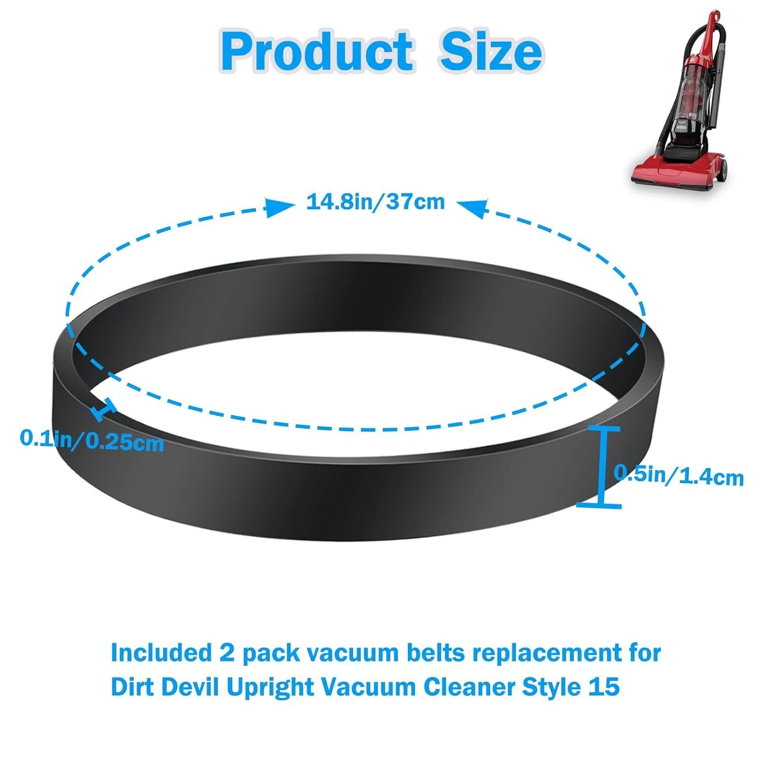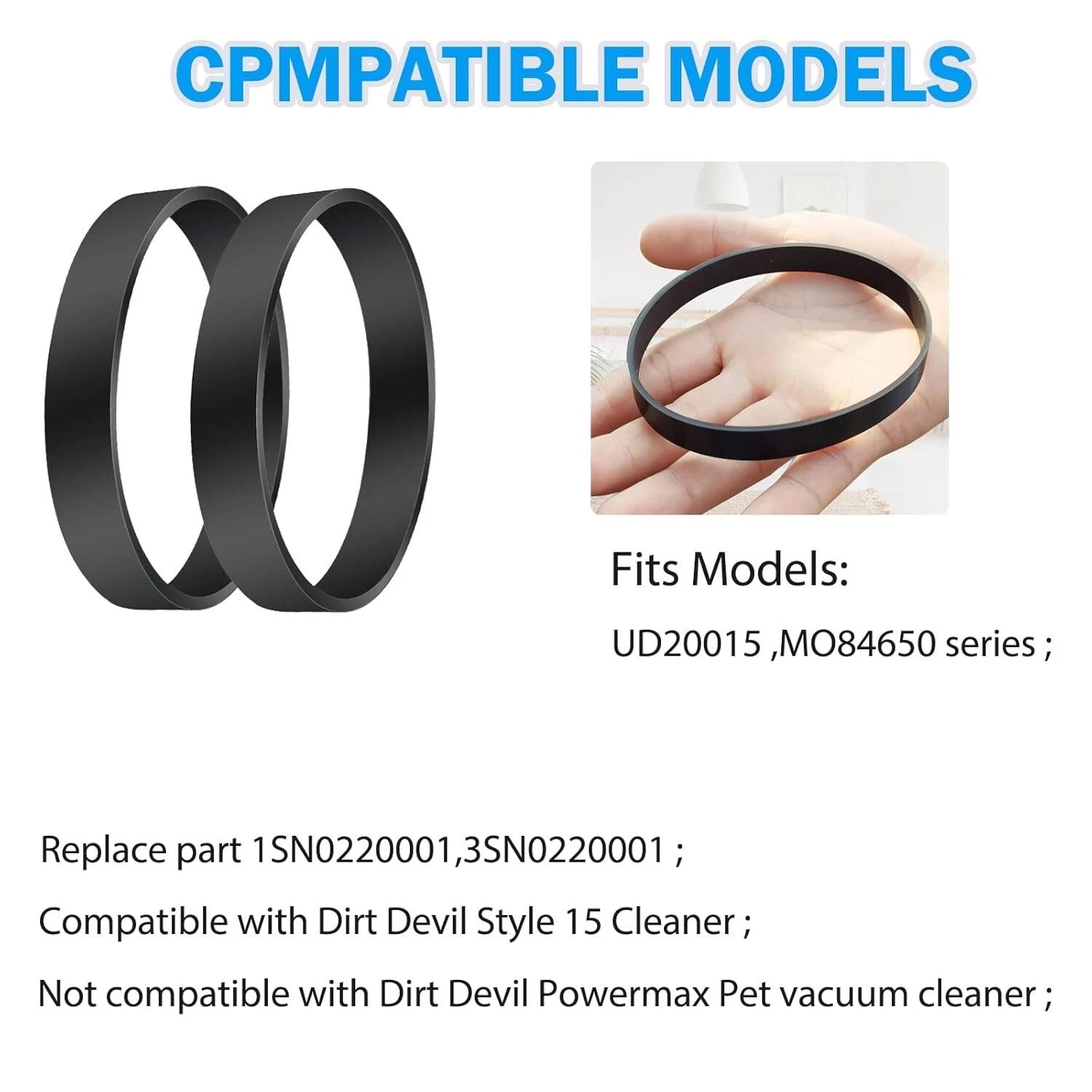 Bro ad Compatibility - These Belts are compatible with Dirt Devil Dynamite,Extreme,Vibe Vacuum UD40095, M084500V, UD40295, UD40225, UD40240, UD40030, UD40225DI, UD40085,M084610,UD40245,UD40250,M084506 M084605, M084607, M084612, UD40290, UD40195, M084616, UD40210, M084650, UD40105, UD40035, UD40100, M084606, M084613, UD40300, M084505, M084651, UD40215, UD40230, M084650RED, R084600, M084650HD, M084611, M084610RED, UD40220, M084600, UD40045, UD40050, M084510, M084650SC, M084615, UD20020, UD20050 & models using Dirt Devil Style 15 Belt. Customized Made - Made of elastic rubber, durable and flexible, long-lasting reliability, making vacuuming more powerfully. Easy to Replace - Simply remove the damaged belt from your vacuum head and replace this new drive belt in the original position, bring your vacuum cleaner back to life! Warm Tips - Replace your vacuum cleaner belts every 3 to 9 months to ensure optimum performance of your vacuum cleaner. What You Get - Each package contains 2 Replacement Belts 3SN0220001 for Dirt Devil Style 15 Dynamite and Power Express Upright Vacuum.