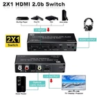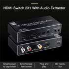 2x1 HDMI Switch Audio Extractor With R/L+Toslink SPDIF+COAXIAL Audio Out Adapter 4K 2 In 1 Out HDMI ARC Audio Switcher Selector Specifications: Compatible with HDMI2.0 and high-definition TV with HDCP2.2 Supports high-resolution input of 480P, 720P, 1080P, 1080P 3D, 4K60Hz Support compressed audio: DTS Digital, Dolby Digital (DTS-HD and DOLBY) with Audio Separation and Audio Return Function (ARC) Supports HDMI2.0 (4; 4; 4 RGB) Supports MHL function and has LED indication function Supports automatic identification of signal sources, and automatically jumps to the next port with a signal source when the signal source is disconnected, Automatically jump to newly inserted HDMI signal source Supports high-definition signal with remote control Supports video transmission with broadband of 3Gbps/300MHz Power supply: 5V1A(Included 5V1A power adapter) Feature: 1. 4K@60HZ 2X1 HDMI SWITCH with AUDIO EXTRACTOR: This 4K HDMI Switch allows you connect Two HDMI 2.0 Sources to one display device, Each input source support audio extract by the Toslink+L/R+Coaxial audio output channel. No loss of quality after you split the signal. No degradation in audio quality. (HDMI output support CEC) 2. ULTRA HD 4K VISUAL ENJOYMENT: Supports HDCP 2.2, HDMI2.0b, 4K@60HZ, RGB4:4:4, Full HD, UHD, HDTV, Deep Color to 36bit,also back compatible with 4K@30HZ and 1080P. Max Bandwidth of 18.2Gbps.(Kindly Note: It is not compatible with DVI) 3. HDMI ADUIO EXTRACTOR: With Optical Tolink SPDIF+L/R+3.5mm Jack+Coaxial audio out allows you extract the audio from the HDMI input source ( Like For PS4, Cable box, For Xbox or any HDMI device)connection to a spearker, Amplifier etc. Note: If you choose optical or coaxial audio out, you can enjoy 5.1CH or 2CH or audio copy. If you choose 3.5mm or L/R audio out, you can enjoy 2CH or audio copy. 4. HDMI ARC ADAPTER: Supports ARC (Audio Return Channel), Extractor the Audio from TV to Soundbar or Amplifier. Connect your TV HDMI(ARC) Port to this switch HDMI Output Port with HDMI Cable, then using optical or Coaxial cable to the soundbar, Speaker, home theater, A/V receivers etc.No distortion of audio or video(Note:3.5mm jack and L/R audio port not support ARC audio) 5. Smart Auto-Switch with Remote Control: It will automatically skip to the most recently inserted HDMI signal source,it will automatic change from HDMI source A to HDMI source B when you turned on source B and back to source A when you turned source B off Product List: 1x HDMI switcher 1x IR remote control(Included 1*CR2025 battery) 1x USB power cable 1x 5V Power adapter 1x User manual