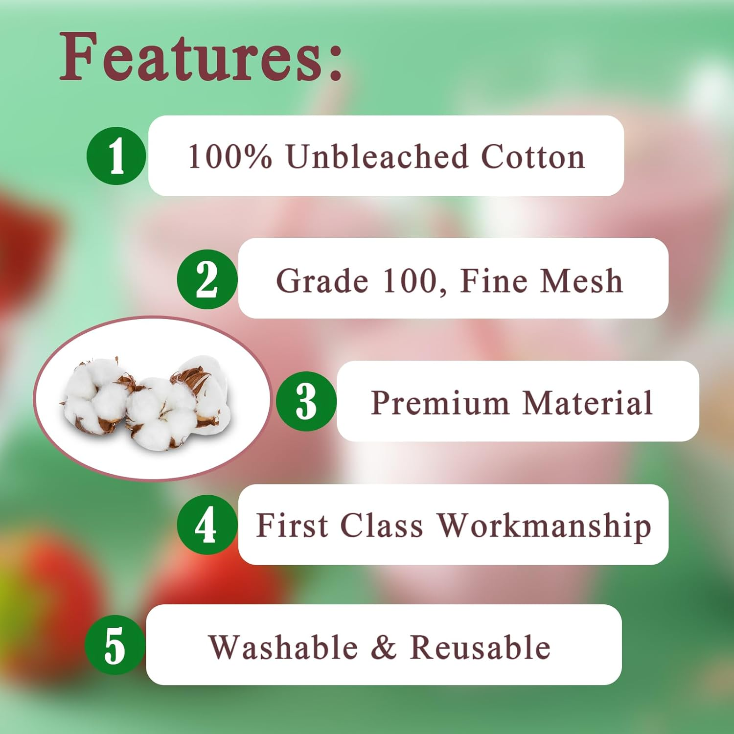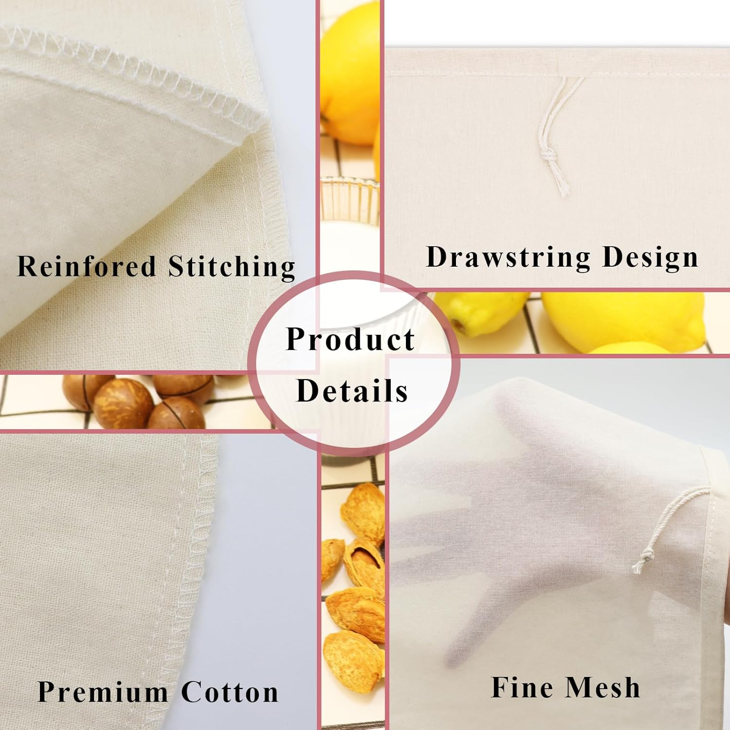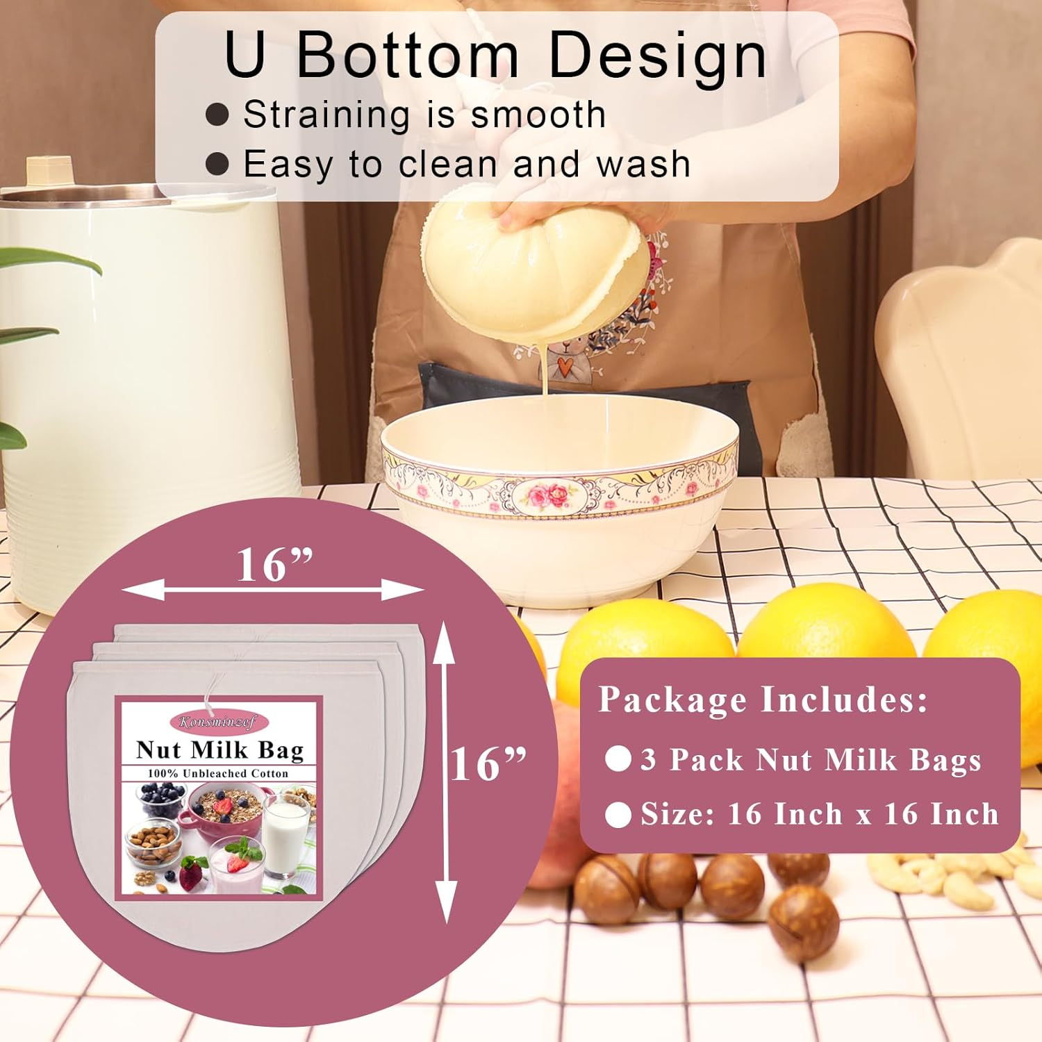 【Unbleached Cotton】Konsminzef nut milk bags is made of 100% unbleached cotton, food grade bag, ECO friendly. The cheese cloth bag is ultra fine mesh, it is excellent strainer bag to help you prepare homemade drinks. 【U Shape Design,Extra Large 16"】 The U shape design makes the squeeze more smoothly, no worry about the pulp stuck in corners, the curve design makes the clean and wash so easy. The nut milk bag with moderate extra large size 16 x16 Inch, 3 Pack in one package. it is a good strainer bag for your homemade drink. 【Reinforced Edge Sewn 】 The cotton cheese cloth bag is sewn by reinfored stitching, sturdy and resuable. Drawstring design will allow you tighten the bag if needed,it is ideal straining bag for your kitchen and househould. 【Widely Application 】 This cheese cloth bag is multiple uses for household and kitchen, such as making homemade nut milk coconut almond Oat Soy milk, vegetable or fruit juices, cheese, yogurt, butter, cold brew coffee, beer home brewing, tea etc. Superior straining bag for soup, herbs. It can be also used for bean, nut,food, dry flowers storage, or dust prevention etc. 【Washable and Reusable】This cotton nut milk bag is washable and reusable. The round bottom make the straining more smoothly. Since no pulp stuck in corners, it will be easy to clean and wash. Just hand wash with warm soap, rinse, dry in air for next time use. Product Description Simple and Easy Use Nut Milk Bag for Your Healthy Life TOur products are made of 100% unbleached cotton, they are washable & reusable. These nut bags will help you strain your nut milk or juice very simply. Choose our cheesecloth bag, you will get your natural favorite food & drinks nutritious and healthy. How to Get Your Favourite Drinks? Filter Bag Features: 100% Unbleached Cotton Cheesecloth Our nut milk bags are made of 100% unbleached natural cotton, food grade cheesecloth. washable & reusable. Fine Mesh Cloth, Reinforced Stitching The nut bag is sewn with fine mesh cloth, reinforced stitching. With this tighter weave, your home made drink will be more fine and smooth. Drawstring Design These cheese cloth bags are made with drawstrings, very convenient to tight or hang for your need. Excellent Strainer Bag for Household or Commercial Use For All Kinds of Nut Milk Straining These nut bags are perfect for all kinds of nut milk, almond milk, oat milk, soy milk straining. Only a few steps, your nut milk is done. Vegetable and Fruit Juice Squeezing Just blend your favourite vegetable or fruit Juice and use this cotton bag to squeeze, it will help you remove the pulp and get the natural juice fast. Start your healthy life from using this cloth bag for the fresh favourite drinks. Cheese and Greek Yogurt Making You can use these cloth bags to make cheese or Greek yogurt. With this nut milk bag, home made food and drinks become so easy.