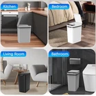 【Motion Sensor Trash Can】 This automatic trash can utilizes advanced infrared sensing technology, 0.1 seconds of sensing automatically open the lid, and automatically close the lid if no object movement is detected within 5 seconds. The touchless trash can is powered by 2 AA batteries (not included) 【3 Pack Automatic Trashcan】Our trash bin set comes in 3 as a bundle which should be the perfect amount for household use. They are the perfect size to fit your bathroom, kitchen, bedroom and living room. The slim design makes them very suitable for placement under sinks, desks, and cabinets 【Sturdy & Waterproof】 Crafted from premium-grade ABS material, this small trash can with lid boasts high durability and resistance to wear and tear. With an IPX5 waterproof rating, the waste basket can adapt to the bathroom splash environment that ensures a long time use 【Slim & Odor Free】 Measuring 9.2"(L) x 6.2" (W)x 12.6"(H) and 2.5 Gallon Capacity, this small garbage can is the perfect size for tight spaces. The smart trash can with lid ensures a fully sealed enclosure that effectively isolates odors from garbage, maintaining a fresh indoor environment 【Versatile & Practical】Whether you need a small bin for your bathroom, bedroom, or office, our wastebasket is a perfect choice. Stackable design enables nesting for easy transport and storage. This garbage bin is also easy to clean and maintain, making it very convenient to use