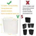 Narrow Trash Can -- These 3.2 gallon trash cans are pretty awesome! They fit everywhere especially small spaces sush as under the kitchen sinks, under the desk, at the table, beside kitchen cabinets, beside bathroom toilet, beside the bed. Widely Used -- These small garbage can can be put in many places, like the living room, office, bedroom, bathroom, kitchen, apartments, dorm rooms, condos, cabins, campers, and RVs. Also, You can use the trash can for kids room to collect toys. Portable Small Waste Basket -- With built-in handle, no more putting your hand inside top of can to pull it out. Slim and lightweight this versatile trash and recycling bin can be used in any room in your home. Easy to Clean -- The interior of the Wastebasket is smooth ensures that you can easily clean it and rinse in clean water. And exterior surface with frosted texture finish, wear-resistant, scratch-resistant, look like modern and simple. Premium Material -- The design of our wastebasket is sleek. Adopting high quality durable shatter-resistant plastic, it is lightweight but compact and sturdy. Each Measures 12.7" x 5.6" x 10.5" high, 3.2 gallon/ 12-liter capacity.