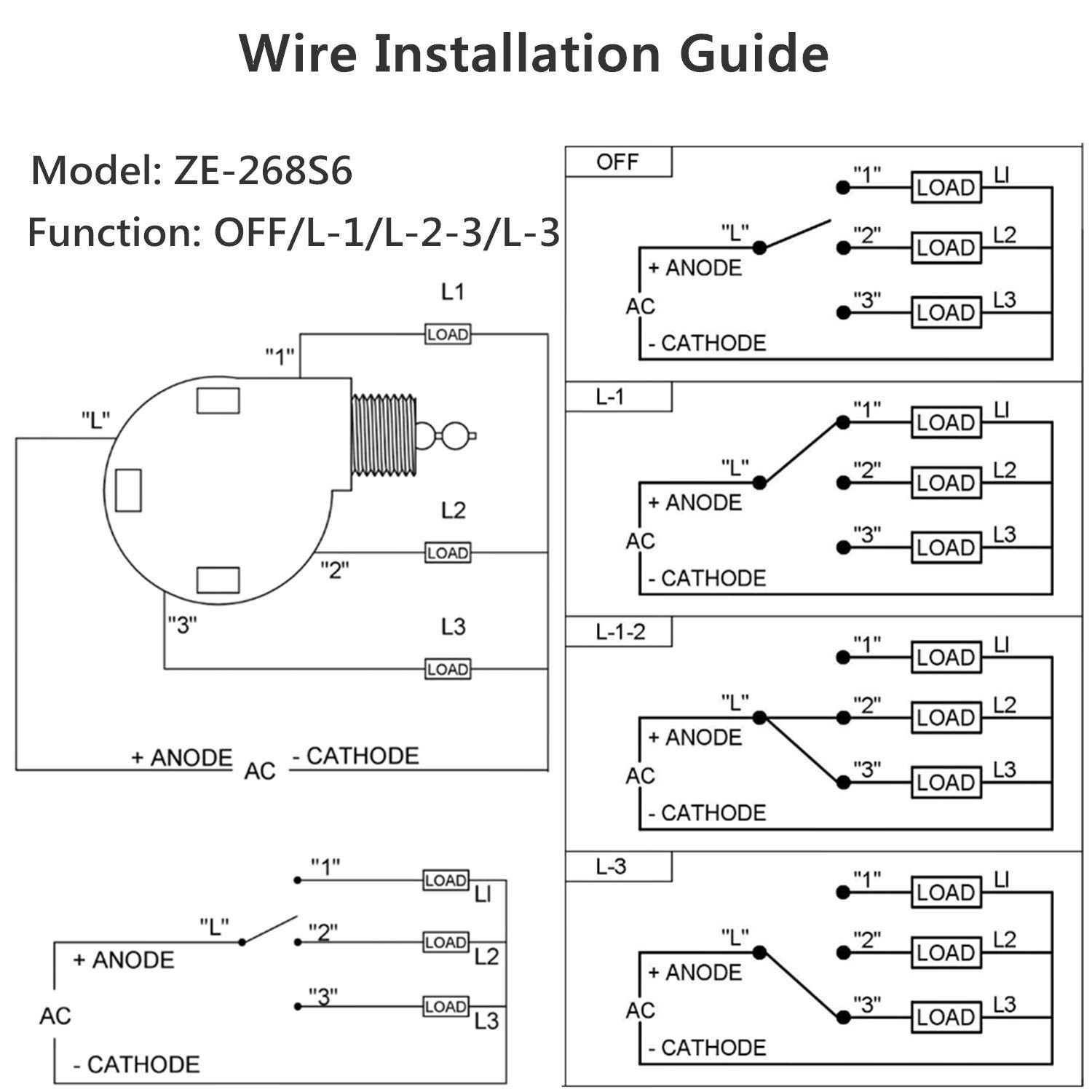 Product Page Ceiling Fan Switch 3 Speed 4 Wire Zing Ear ZE 268S6 Pull Chain Switch Description: ZE-268S6 ceiling fan switch 3 speed 4 wire rotary control switch is designed for 4-wire installations. This is a single pole, triple throw switch with four positions. Must pay attention to electricity safety Kindly remind: Please disconnect the power to the fan before removing the old switch and make sure to write down the position of all wires that you disconnect in the process of removing the switch. Specification: 3 speed control: High, Medium, Low 4 Wire OFF,L-1, L-2-3, L-3 Switch Type: Pull chain switch Thickness: 2 centimeters Operating voltage: 125 ~ 250 V Overload current: 6 A Rotation angle: 360 degrees Electrical Rating: 6A/125VAC - 3A/250VAC Certifications: UL approved (USA) - CSA certified (Canada) What's included in your package: 1PCS Ceiling Fan Switch Features: Zing Ear Ceiling Fan Switch 3 speed 4 wire pull chain replacment: Model ZE-268S6. 3 Speed control: high, medium, low ; Function: off, L-1, L-2-3, L-3 Ceiling Fan Parts Certifications: UL approved (USA) - CSA certified (Canada). ZE-268S6 Ceiling Fan Switch Electrical Rating: 6A/125VAC - 3A/250VAC. Perfect for home applications such as Ceiling Fans, Wall Lamps, Cabinet Light. Works in Hunter, Casablanca, Harbor Breeze, Hampton Bay and so on