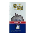 About this item 20 count 13 gallon Convenient flap tie closure Affordable Tall trash bag Ideal and convenient for everyday household use Made from LDPE plastic Come in an easy-to-open cardboard box