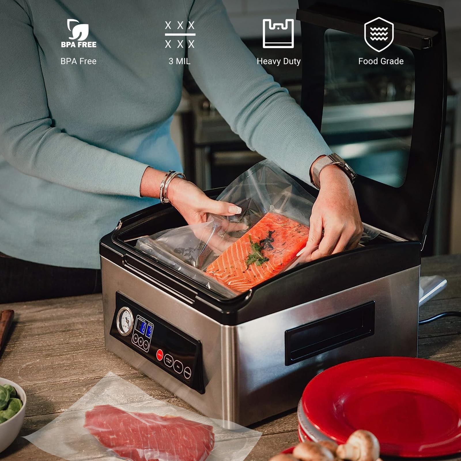 Chamber Vacuum Sealer Bags 300 Count 6" x 10" 8" x 12" 10" x 13" For 3-Mil Vacuum Chamber Bags Pre-Cut Chamber Vacuum Bags- BPA-Free -Heavy Duty Chamber Machine Pouches PAY SPECIAL ATTENTION:3-Mil Pre-Cut Chamber Vacuum Sealer Bags Not Dor Use With External Vacuum Sealer VALUE FOR MONEY, ECONOMICAL:100 GAL Size 10x13 Inch / 25x35 cm,100 Quart Size 8x12 Inch / 20x30 cm Pre-Cut Vacuum Chamber Bags And 100 Pint Size 6x10 Inch / 15x25 cm Pre-Cut Pre-Cut Chamber Vacuum Sealer Bags ,Get Great Value, Reduce Waste, Cut Down On Cost Of Space & Money FOOD SAFE AND HEALTHY: Chamber Machine Pouches Are Made Of Food-Grade, Odorless, And BPA-Free Material, Ensuring Safe And Healthy Food Storage.Suitable For Microwave Oven (-20℃~100℃), Cabinet, Fridge or Freezer Storage KEEP FOOD FRESH FOR LONGER: Vacuum Chamber Bags Remove Air From Bags, Preventing Oxidation And Spoilage To Maintain Rhe Freshness And Taste Of Food.Lock Freshness, Nutrient & Flavor, Block Oxygen And Moisture, Keep Beef, Meat, Fish, Chicken Juicy And Flavorful, Reduce Gritty And Wilting Vegetables And Fruits HEAVY DUTY AND PUNCTURE PREVERNTION:Designed with Food Grade PA+PE Material,with Bone Guards to Prevent Piercing,Heavy Duty Chamber Machine Pouches EASY TO USE: Pre-Cut Chamber Vacuum Sealer Bags For Food Can Be Boiled, Create an Airtight Barrier Around Food But Transmit Heat. You Can Take Frozen Leftovers Out And Toss The Bag In The Microwave Or A Pot Of Boiling Water VERSATILE USE: Vacuum Chamber Bags Are Not Only Suitable For Food Storage But Can Also Be Used To Protect And Preserve Small Items These Seal Bags Block Moisture And Oxygen, Effectively Sealing Soups, Sauces, Marinades And Other Food Items You Have SAVE TIME AND MONEY: Pre-Cut Chamber Vacuum Sealer Bags Keep Food Fresh And Reduce Food Waste, Making Meal Preparation Faster And More Convenient While Saving Time