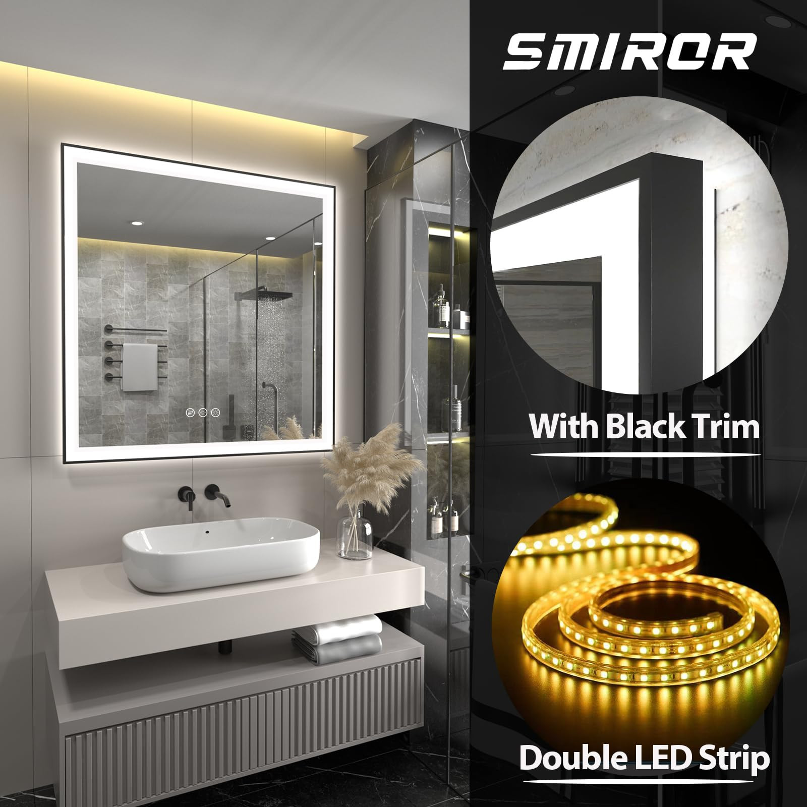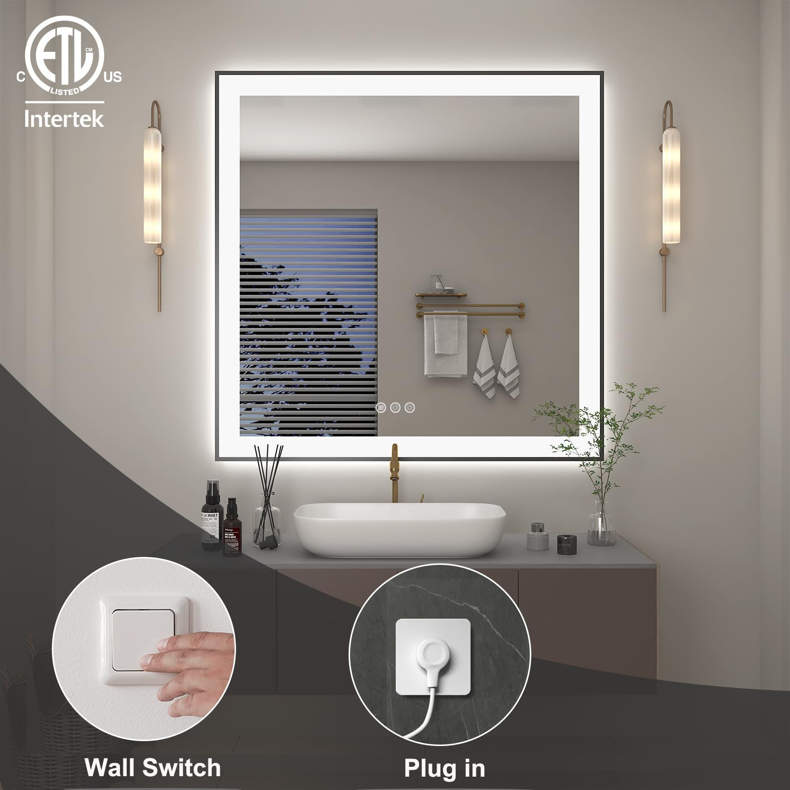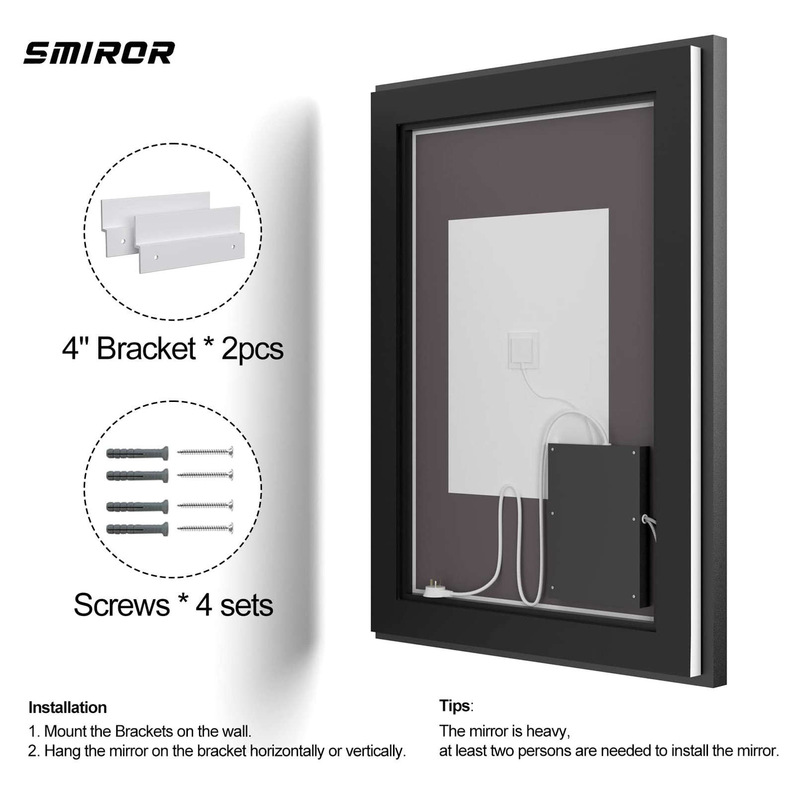 Front lit + Backlit : In order to have a brighter lighting effect, all Led mirrors are with double led strips, one for front lights, which is built -in the mirror and sightless, the other is around the edge of the mirror for back lights, which is replaceable if broken; With double lighting, the lighted mirror is bright enough for daily makeup, shaving, salon or hair care, bright and without dark shadows LED Bathroom Mirror with Black Trim : Differ from other framless mirror, led mirror with with thin black frame, modern and stylish looking, adding high-end feeling for your new bathroom or remodel 3 Colors Separately Control and Dimmable : There are three color tones for led illuminated mirror (warm white, natural light, and cool white), and each color is dimmable; You can choose to turn on only the back light or front lit or have them both on simultaneously, selecting different lighting effects for different atmospheres, and the last lighting mode will be remembered Anti-Fog : bathroom vanity mirror is clear and fog less after the shower; The defogger automatically turns off after 1 hour, saving energy and preventing accidental operation Easy Installation : Hang the rectangle mirror horizontally or vertically on the brackets fixed on the wall; Due to the wall mirror's heavy weight, it requires at least two people for installation; The led lighting is powered by hardwire or plug in