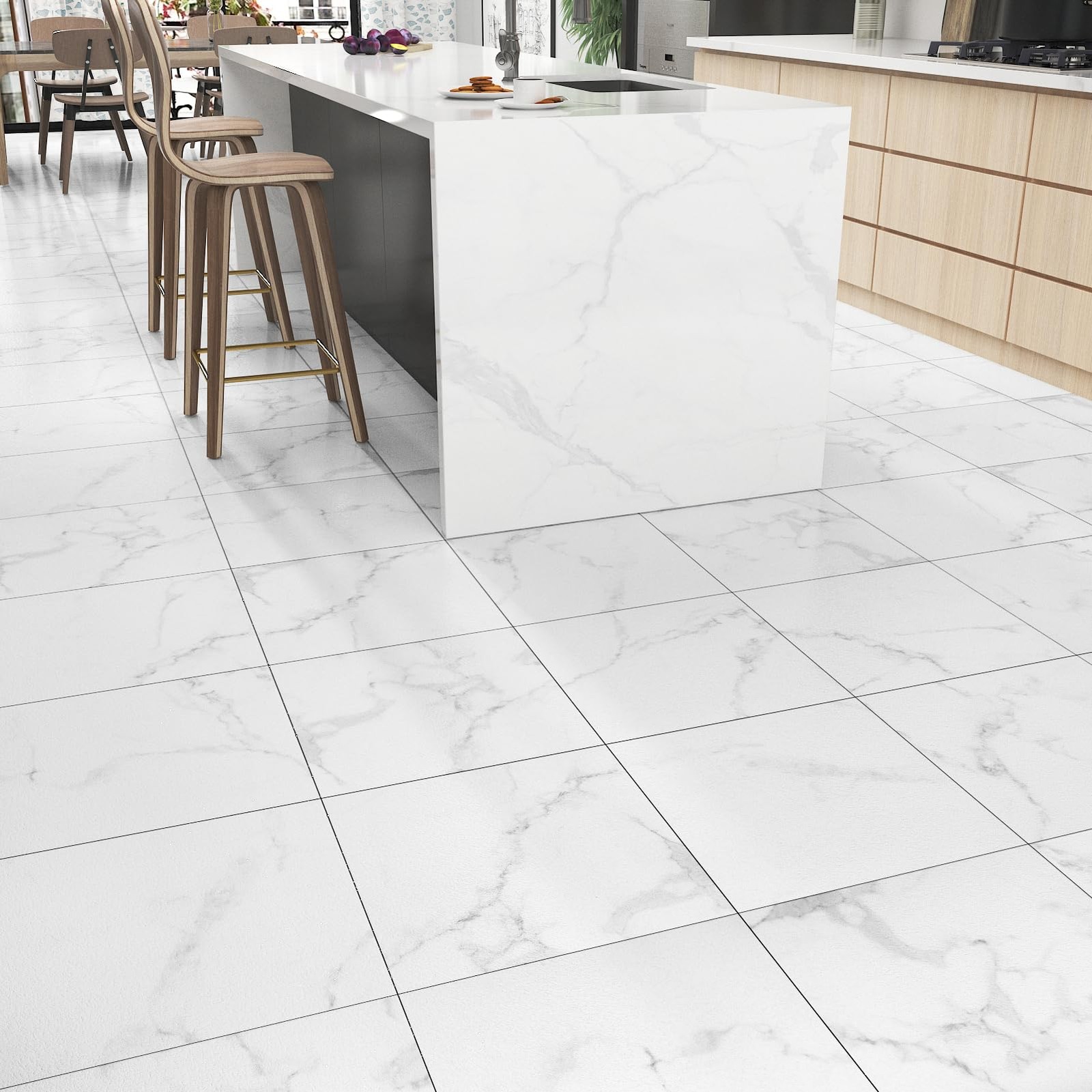 "Size: 12x12 inch,thickness is 0.058 inches/per tile, Waterproof. Self adhesive vinyl flooring are a peel and stick product, just peel off, used for house owners, renter friendly, making them ideally suited for DIY. Easy to install: No grout or special tools needed. Easy to cut, great adhesion allows them to be lifted for adjustment, removable without damaging the target surface and leaving sticky things. The stick and peel floor tiles are made of upgraded vinyl, thickened and durable version. Don't need to worry about damage easily. Tips: Please buy enough wallpaper at one time to avoid slight color difference between different batches. Before using peel and stick vinyl flooring, try to keep the surface dry, clean and smooth. Due to different angles of camera and light, there might be slight chromatic aberration." Peel and Stick Vinyl Tile: Easily transform any flat and dry flooring with our Vinyl Flooring Tiles. Our 32 pcs white marble floor tiles are perfect for DIYers as they require no grout or special tools for installation.Just peel and stick. Detailed Design: 12" x 12" x 1.5mm, (4 tiles per box). 1.5mm≈0.058 inches. 32 pieces of vinyl tiles can cover 32 square feet . Our vinyl flooring tiles offer an affordable way to give your room a brand new look. The white marble design is timeless and will elevate the aesthetic of any space. and stick it to the surface. It can decorate your space. Versatile Application: Our peel and stick vinyl flooring tiles are ideal for indoor use. They are waterproof and easy to install, making them perfect for renters, kids' playrooms, entryways, gyms, dance rooms, kitchens, bedrooms, and bathrooms. Durable and Waterproof: Our vinyl flooring tiles are protected with a sturdy layer that makes it resistant to scratches, dents, stains, and water damage. It's easy to install, simply stick on floor and easy to cut.This ensures that your floors remain stylish and functional for years to come. TIPS:There may be slight color differences in different batches. Please order enough pieces at a time to avoid color differences. If you have any questions about thicken marble vinyl flooring, please feel free to contact us or ask in Q&A.