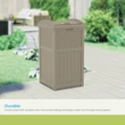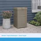 Keep unsightly garbage and recyclables out of view with the TRASH HIDEAWAY Refuse Container. The decorative yet functional design is compatible with standard 30-33 gal. garbage bags, ensuring ease of use. Plus, the unit features a stylish, contemporary wicker-style design that will look great on any patio or deck, beautifully complementing most furniture. Additionally, the TRASH HIDEAWAY technology features a secure latching design to help keep trash in and critters out. When it comes to cleanup, there's no better solution for your space. OUTDOOR TRASH CAN WITH LID: Outdoor trash can has a capacity of 30 to 33 gallons that is ideal for backyards, patios, or decks DURABLE: Constructed with durable resin that resists fading and keeps water out through every season FUNCTIONAL DESIGN: Lid is hinged for easy access and, latches securely so garbage stays in the bin, keeping your backyard area clean DECORATIVE: With a wicker design, this dark taupe can is an attractive solution for your refuse that will match most outdoor décor COMPACT SIZE: Trash can is built to maximize function while minimizing impact to your living space (measures 15. 75" x 16" x 31. 6")