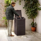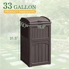 33 Gallon Outdoor Trash Can for Patio Feature: The trash is in imitation rattan weaving design. Made of high quality resin material, the trash can is waterproof and UV proof. And it is suitable to be used as a mailbox. Specification Color: Dark Brown Package Dimensions: 31.69"(L) x 17.72"(W) x 7.87"(H) Package includes: A trash bin A manual of installation and usage Notice: There may be some differences between photos and items in term of color, because of the influence of lighting during the shooting or the settings of the computers’ display screen. Outdoor Patio Trash Can: Designed with imitation rattan weaving patterns, this outdoor waste bin not only looks beautiful, but also has strong practical functions. It is waterproof, UV-resistant, fade and warp-resistant, and can meet the needs of different scenarios Multi-Functional Use: This resin outdoor trash can withstand the effects of various outdoor elements, preventing the entry of water and dust. It can also be used as an outdoor storage bin, suitable for patio, swimming pool and other multi-scenario use needs Large Storage Space: This trash can has a storage capacity of 33 gallons and measures 16.5”(L) x 15.7”(W) x 31.5”(H). It can fit garbage bags in 30-33 gallon Dual Lid Desin: On the top, there is a securely latched lid, and you can easily open it by simply pressing the position with the logo “press” printed. You can easily change the garbage bag by lifting the external lid. Also, the external lid holds the trash bag in place so it won't move around easily Easy to Assemble: The trash can is easy to assemble within 10 minutes with no screws needed