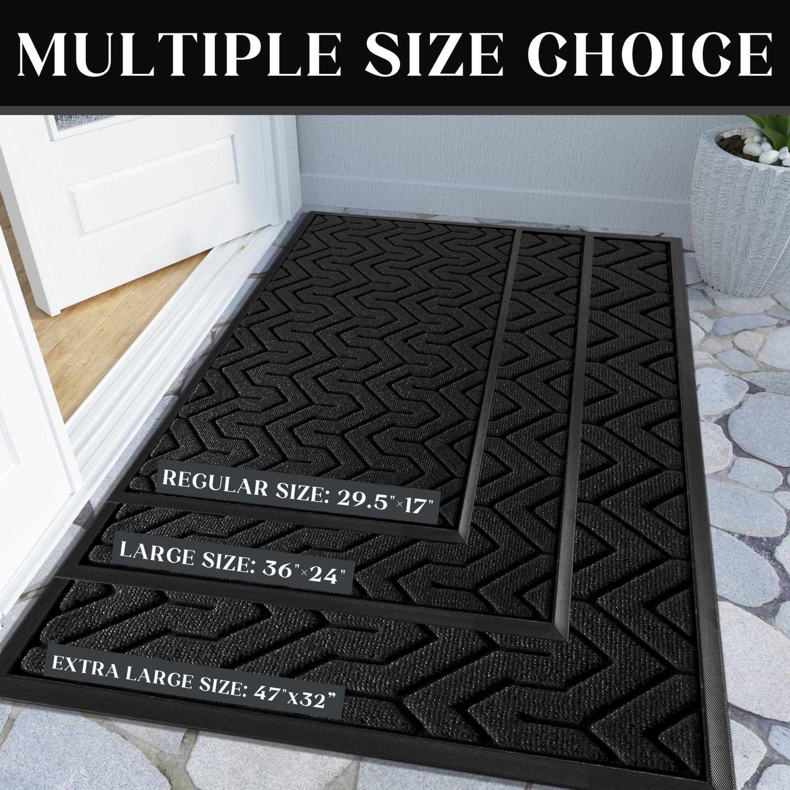 【Capture Dirt and Moisture】: front door mat adopts triangular striped groove design, forming a detention dam extending in all directions, helping to capture dirt, dust, gravel, mud, sand, grass or other messy debris and prevent them from entering Indoor; The surface of floor mat beautifully woven polyester fabric absorbs moisture, and the sturdy oblique rubber edge will not accumulate water in rainy and snowy days, keeping your home dry and clean 【Rugged and Sturdy】: The surface of this outdoor mat is made of high-quality polyester, unique Hot-melt Planting Production Process, which is designed to be sturdy, strong and flexible. The doormat in outside can withstand a variety of weather and seasonal changes, whether it is sunny, rainy or snowy 【Easy to Clean】: front door mats outdoor, Just use a vacuum cleaner, or sweep with a broom, or tap the backing and shake the doormat. For more in-depth cleaning, use a garden hose to rinse the floor mat, then hang it in a ventilated place to air dry it 【Non Slip Rubber Backing】: heavy duty door mat, 0.20 inch ultra-thin design, can glide under most doors without jamming or curling. The outdoor mat uses a high-quality non-slip rubber backing to help prevent you from slipping when entering or going out, keeping you safe. At the same time, the rubber backing can prevent water and mud from penetrating the floor, keeping door rug in place and not sliding or wear the floor and effectively protect your floor 【Wide Use】: versatile welcome mats are stylish and practical, suitable for indoor use to keep the floors of homes, living spaces, lobbies and offices clean, or outdoor use in front doors, sidewalks, terraces, garages, barns, driveways and many others busy areas; Heavy and sturdy materials, soft and flexible; Simple and stylish design complements any decoration
