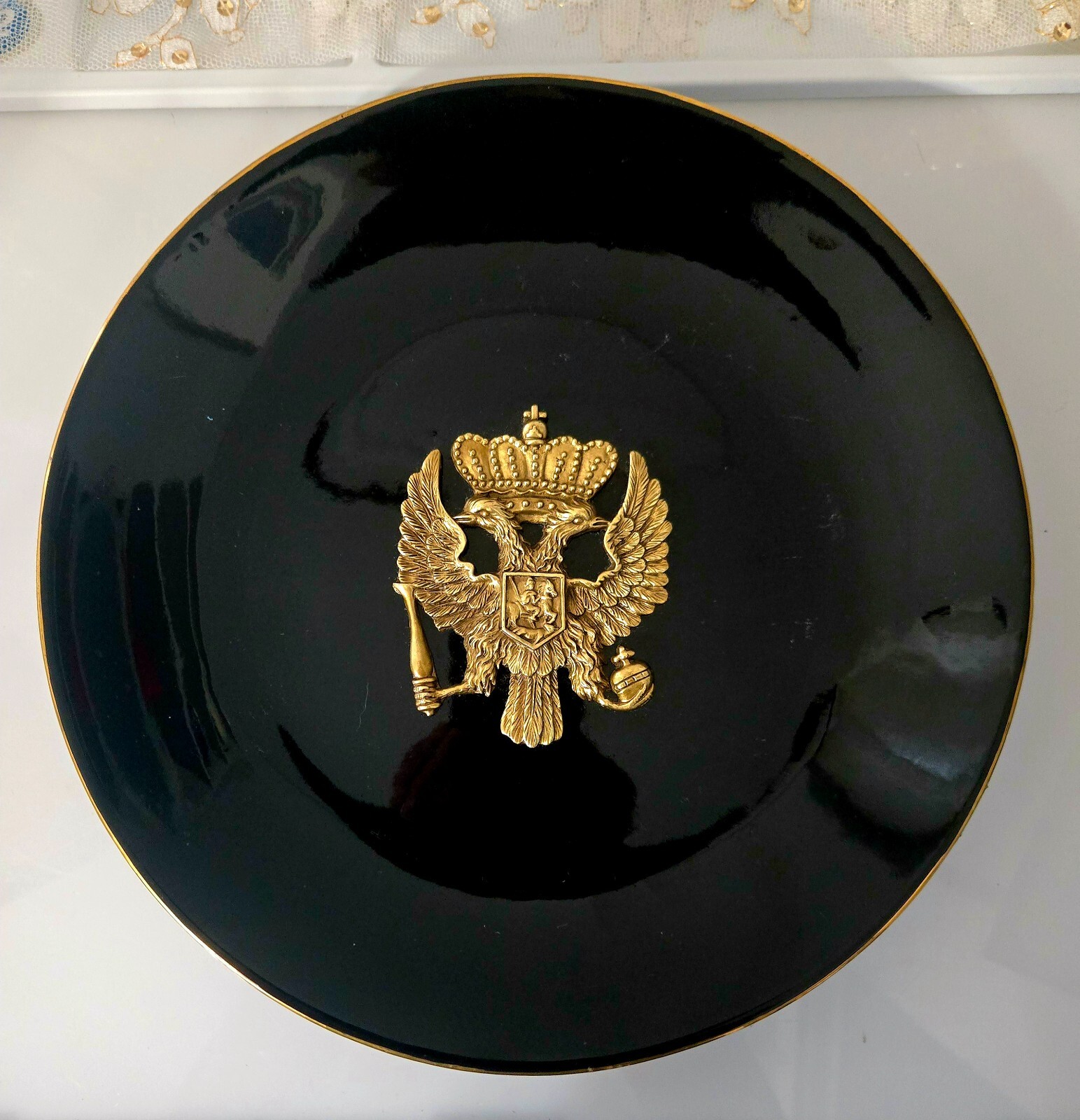 The product is a set of three heavy black ceramic collector plates with a round shape and a diameter of 10.5 inches. Each plate features a 3D brass design of various coat of arms representing Russia and Spain. These decorative plates are intended for hanging on the wall and would make a unique addition to any collector's display. There is some normal wear -- see pictures. The intricate designs and cultural significance of the coat of arms add a touch of history and elegance to these collector items. J083