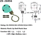 Ceiling Fan Switch ZE-268S6 3 Speed 4 Wire Bronze Zing Ear For Ceiling Light Fan Description : Ceiling Fan Switch 3 speed 4 wire pull chain replacment, Model: Zing Ear ZE-268s6. 3 Speed control: high, medium, low ; Function: off, L-1, L-2-3, L-3 Compatible with Hunter, Casablanca, Harbor Breeze, Hampton Bay, widely used in ceiling fans, wall lights, cabinet lights. Ceiling Fan Parts Certifications: UL approved (USA) - CSA certified (Canada). ZE-268S6 Ceiling Fan Switch Electrical Rating: 6A/125VAC - 3A/253VAC.