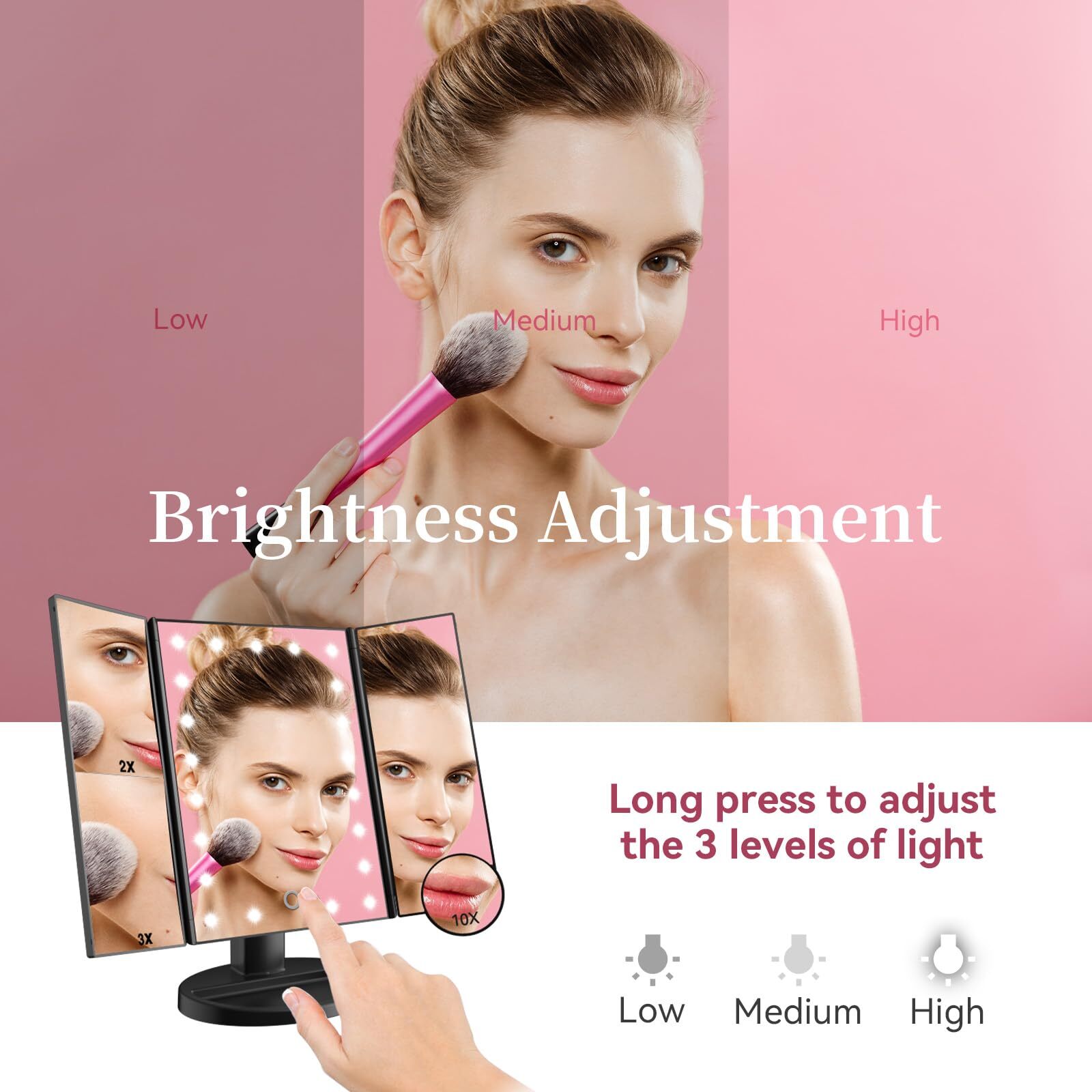 This lighted makeup mirror is a game-changer! The adjustable 1X-10X magnification is perfect for precise application, and the soft LED lighting is bright yet gentle on the eyes. Love the touch control and dual power options—so convenient! The portable design makes it great for travel, and the high-quality build feels luxurious. A must-have for makeup lovers, and it makes a fantastic gift too. Very satisfied with this purchase!