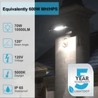 2024 NEW VERSION: 70w led flood light outdoor with 76 ultra-bright LEDs produces up to 10500 lumens 5000K bright light, saving over 85% of the electricity bill compared with the equivalent traditional halogen bulb of 420 watts, no longer worry about high electricity costs. 180° TRUNNION ANGLE & OVER 120° WIDER BEAM ANGLE: 180° trunnion angle can be adjustable. The elastic screw adjusts the bracket to flexibly change the area of light exposure. Effective shock resistance of tempered glass mask with soft light effectively reduces glare and provides efficient lighting for your larger area environment. After many years of use, the lamp body is still bright without damage. 100W FloodLights Recommend Install Height at 10~16 ft. diameter: 32-40ft. IP65 WATERPROOF & LONG LIFESPAN: Die-cast aluminum material outdoor flood light, high-transparency lenses, stainless steel screws, high hardness, and high-temperature resistance. Waterproof flood lights outdoors are used in a wide temperature range (-22+113f). The waterproof joints effectively isolate rainwater. This outdoor flood light back strip design has fast heat dissipation and provides up to 30,000+ hours of lifespan. The floodlight can work well in rain, sleet, and snow. WALL MOUNT BASE & MORE OCCASIONS: 70W Led flood lights with wall mount base can be installed not only on the ceiling, walls, ground, lawn, billboards, and so on. Our LED flood outdoor lights are also suitable for indoor and outdoor and for yards, gardens, barns, front porches, factories, docks, squares, stadiums, and other places where lighting is needed. (DO Not have plug) 5-YEAR ASSURANCE: Installation is a breeze with the included universal junction box mounting plate, requiring no tools. Supported by 's 5-year assurance promise and dedicated 24/7 customer service, these lights are a reliable choice for any outdoor lighting need.