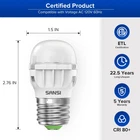 Technical Features: A11 LED Bulb, 45W Equivalent, E26 Base, 5000K Warm White, Non-Dimmable, AC-120V, Instant On. MONEY SAVING AND DURABLE: SANSI A11 LED bulbs can last at least 22.5 years, based on 3 hours/day of usage. 450lm, save up to 85% energy by replacing 40W with 4W. Replacing old incandescent light bulbs for a brighter, more energy-efficient home. High Quality: ETL certified, flicker Free, no glare, no humming, excellent heat dissipation, no light decay, ideal for desk lamps, wall lamps, floor lamps, and open fixtures. COC Patented Technology: The lamp body is made of special ceramic material, with a flame retardant grade of V0; reinforced insulation structure, and no danger of electric shock, safer; the overall shell material reaches WF2 anti-corrosion grade, more reliable and durable; hollow design supplements faster heat dissipation. 5-year Support and 24-hour Customer Service: 5-year warranty, you can use our bulbs with confidence, any after-sales questions. Sansi refrigerator lights do not flicker, very close to daylight color 5000k Through scientific testing, the bulb is allowed to work in a humid environment The refrigerator lights are shaped with a screw E26 base, easy to replace your old bulbs! You can use the bulbs for your ceiling fan lights, table lamps, accent lights, wall lamps, desk lamps, floor lamps, other light fixtures, etc to light up your home. Low Heat, Creates no heat to keep your fridge temperature stay more constant when the door is open, protecting your hands and also the food. A11 E26 LED Bulbs Traditional A11 size easily fits any fixture designed for small A shape appliance bulbs. Suitable for freezers, ceiling lights, bathroom vanity lights, table lamps, floor lamps, etc. With 80+ CRI SANSI fridge light bulb generates more vivid and natural lighting. 5000-Kelvin gives white and refreshing lighting for maximum eye comfort. Wide Application with low power Widely used in refrigerator, bathroom with steam shower, ceiling fan light fixtures, reading lamp and other home light fixtures, etc.