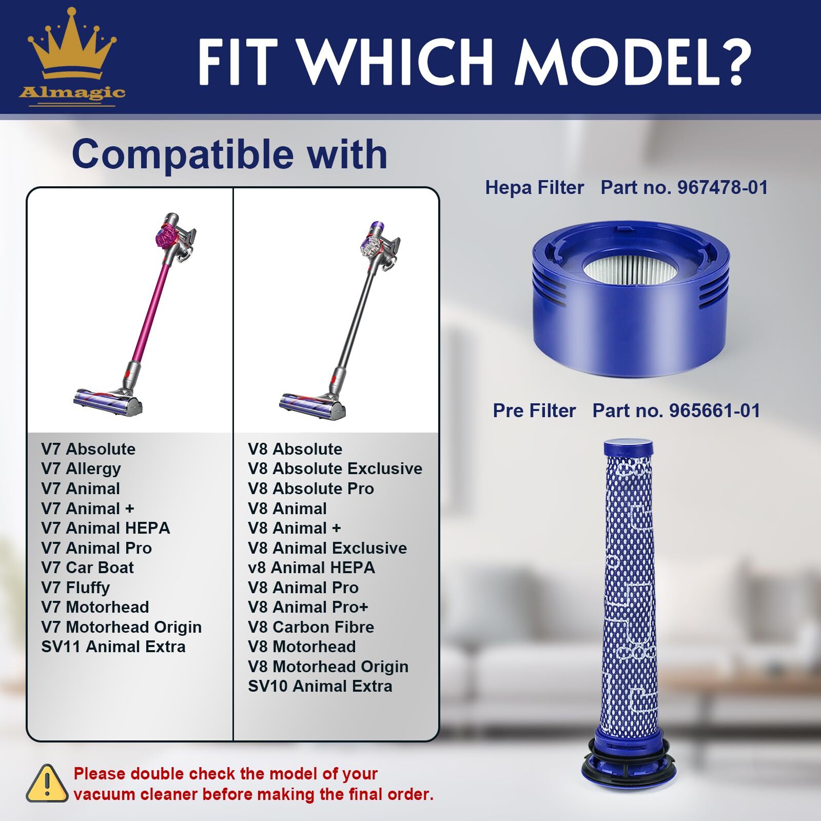 4 Pack Vacuum Filter Replacement, Pre & Hepa Filter Set Compatible with Dyson V7, Dyson V8 Animal, V8 Absolute, SV10, SV11 Vacuum Cleaner, Replacement Filter Part No. 965661-01 & 967478-01 [Package Included]: 4 pcs replacement vacuum filter set of part no. 965661-01 & 967478-01(Pre Filter + Hepa Filter Set). These vacuum filters are designed to fit dyson filter replacement and provide superior performance. [Fits Which Model?]: Compatible with Dyson V7 Absolute, V7 Allergy, V7 Animal, V7 Animal +, V7 Animal HEPA, V7 Animal Pro, V7 Car Boat, V7 Fluffy, V7 Motorhead, V7 Motorhead Origin, SV11 Animal Extra, V8 Absolute, V8 Absolute Exclusive, V8 Absolute Pro, V8 Animal, V8 Animal +, V8 Animal Exclusive, V8 Animal HEPA, V8 Animal Pro, V8 Animal Pro+, V8 Carbon Fiber, V8 Motorhead, V8 Motorhead Origin, SV10 Animal Extra [Washable & Reusable]: Our filter for Dyson vacuum is easy to install and can be reused after washing. Wash it with warm water and let it completely air dry out before reusing them. [Essential Filter Replacement]: Regular vacuum filter replacement every 3-6 months is crucial to ensure optimal performance of your vacuum cleaner, improves home air quality, prevents odors, extends vacuum cleaner lifespan, and maintains the machine energy efficiency. [Service & Warranty]: We are committed to ensure your satisfaction. For any inquiry or issues, please contact us via amazon. 4 Pack Vacuum Filter Replacement, Pre & Hepa Filter Set Compatible with Dyson V7, Dyson V8 Animal, V8 Absolute, SV10, SV11 Vacuum Cleaner, Replacement Filter Part No. 965661-01 & 967478-01 Shipping We offer FREE shipping on all orders! We ship within Three business days of payment, usually sooner. We use a selection of shipping services such as UPS, FedEx, USPS etc. We only ship to the lower 48 states, no APO/FPO addresses or PO Boxes allowed. Local pickups and combined shipping options are not provided at this time. Return You can return a product for up to 30 days from the date you purchased it. Any product you return must be in the same condition you received it and in the original packaging. Please keep the receipt. Feedback Customer satisfaction is very important to us. If you have any problem with your order, please contact us and we will do our best to make you satisfied. Contact Us If you have any queries, please contact us via ebay. We usually respond within 24 hours on weekdays. Please visit our eBay store to check out other items for sale! Thank you for shopping at our store.