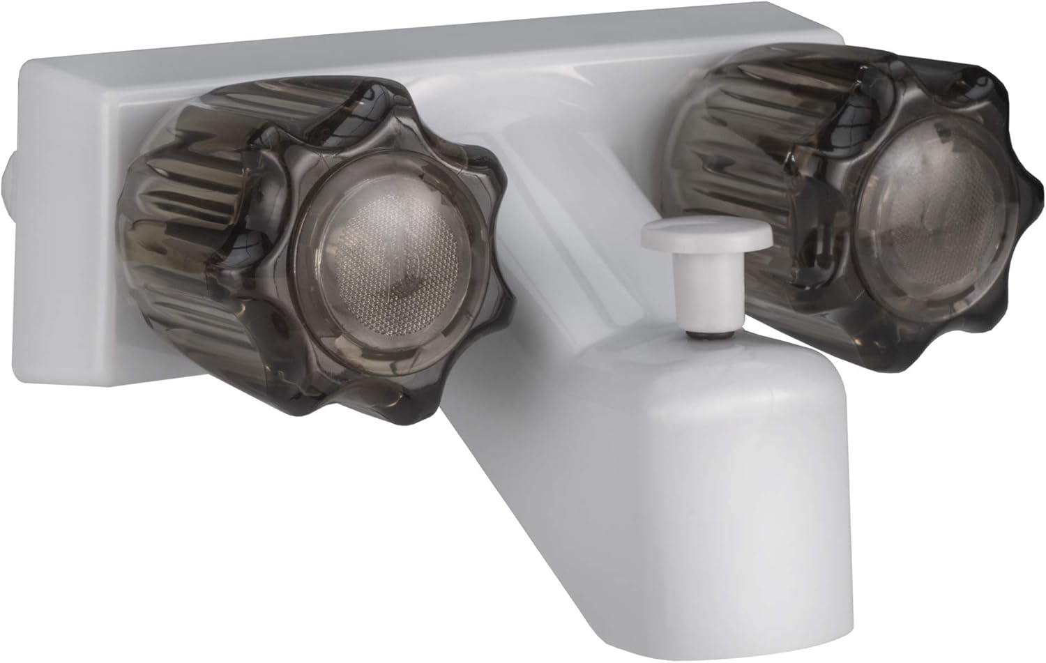 Faucet Dimensions (base) - 6 1/4" W (widest) x 5 7/8" W (tapered) x 2" H Stylized crystal handles Standard hook-ups Solid plastic won't rust Product Description Product Description Diverter Faucet Details: Dimensions (base) - 6 1/4" W (widest) x 5 7/8" W (tapered) x 2" H Dimensions (overall height) 4" H Dimensions (overall depth) - 4" D Stylized crystal handles Standard hook-ups Colors - White/Smoke Front-mounted Plunger handle Solid plastic won't rust Handheld Shower Head Details: Material: Plastic Color: White 2 Washers 4 Screws 4 Anchors Plastic guide ring Plastic bracket