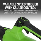 40V 130 MPH / 550 CFM / 75+ Compatible Tools Cordless Brushless Axial Leaf Blower, Tool Only 40V BRUSHLESS BLOWER: Enhanced power, efficiency, and reduced noise. 550 CFM / 130 MPH: Ideal for clearing debris and leaves from hard surfaces and patios. Brushless MOTOR TECHNOLOGY: Delivers 2X more torque for increased power, extended runtimes, quieter operation, and prolonged motor life. VARIABLE SPEED TRIGGER WITH TURBO: Maximized power for moving heavier objects. CRUISE CONTROL & LIGHTWEIGHT DESIGN: Improved handling and reduced user fatigue. Introducing the 40V Cordless Axial Blower, a powerful and efficient solution for all your outdoor clearing needs. This high-performance leaf blower boasts a robust 550 CFM airflow and an impressive 130 MPH airspeed, delivering 28% more air volume than its predecessor. Experience the convenience of gas-like power without the hassle of cords or fuel, thanks to its advanced brushless motor that ensures greater efficiency and a lower noise level. The 40V blower offers up to 34 minutes of runtime on high when powered by a fully charged 4Ah battery (not included), allowing you to tackle all your projects with ease. Enjoy precise control with the variable speed trigger and cruise control, which enable you to adjust the airflow according to your specific requirements. For those moments when maximum power is needed, simply engage the turbo button for an extra boost. With the 40V Cordless Axial Blower, you can experience unparalleled performance, convenience, and control in a battery-powered tool. Clear your outdoor spaces effortlessly and enjoy the freedom of cordless technology.