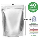 Wide Bottom An expandable, pleated bottom allows each bag to stand upright on its own, saving space in cupboards, cabinets storage containers and deep drawers. Freezer safe and food grade friendly. Reusable and Strong Sealing Zipper Two options for sealing the mylar bags: a reusable zipper seal and permanent heat seal. You can heat seal using an impulse sealer, hair straightener, or household iron. Keeps out light and air for short or long-term storage. Rounded Corner & U-shaped Notch Designed with rounded corners for safety and comfort and easy-tear U-shaped notches. Specifications Three-Layered Material: PET, Aluminum foil and PE (No Recycled Raw Materials Used) Total Thickness: 8.6mil (each side is 4.3mil thick) Features: Bag stands upright for Easy Filling Includes: 40pcs x 1 Gallon Mylar Bags (10” x 14”) 40pcs x 300cc Oxygen Absorbers 40pcs x Label Stickers Includes 40pcs of 300cc Oxygen Absorbers 40pcs packed in 2 vacuum-sealed bags of 20 to maintain dryness. Note: Oxygen absorbers will not extract all the air inside your mylar bag. These are not vacuum packs. Oxygen absorber will remove all the oxygen (21 % of the air) from your bags to preserve your food longer. Includes 40 Labels Our set includes 40 stick-on labels to help you stay organized without needing to write directly on the bags. Heat Sealable - Instructions An impulse sealer is great if you have one, but household irons and hair straighteners can also be used to seal the bags. Hair straightener: Place on highest heat setting. Starting at one side of the bag, clamp straightener down for 2-3 seconds. Repeat in sections while slightly overlapping sealed areas, working your way across the top. This will permanently join the front and back of the bag together. Household iron: High heat (NO steam setting). Use a piece of wood to iron against for support. Place top flap of the bag over wood and push against it to iron. Start at one side of the bag and iron a wide strip for 2-3 seconds, permanently joining the front and back together. Continue sealing across the rest of the top. Impulse sealer: Medium-High pressure level. Lay top of bag in alignment with grip mark on impulse sealer. Lower top mechanism and keep sealer shut until light turns OFF. Wait briefly before raising top mechanism, allowing sealer and bag to cool down. Payment Shipping Feedback About us Contact us Payment 1. We accept PayPal,G Pay Credit Card,Visa ,etc. payment . 2. Please do not include your PO BOX address, or eBay system won't allow you to make the payment. 3. Please make payment within 7 days after placing an order, or eBay will automatically open an unpaid case on the eighth day. 4. You can contact us for sure if you want to cancel the order to avoid the unpaid case. Shipping 1. All orders ship within 24 hours after receiving your payment. 2. Tracking information will be sent to the buyer once we get the tracking number. 3. We only ship to eBay or PayPal address. PO. BOX Not Acceptable. 4. If you want us to ship to a different address, please contact us via eBay message after placing your order Feedback 1. We are really appreciated that all the customers can give us 5-star positive feedback. It will encourage us doing better, no matter the quality of the products or after sale service. We are learning more. 2. Please don't give us neutral and negative feedback before contacting us. Don't forget that good communication can solve all problems. Any questions, please feel free to send message to us first. We are always here to help you. Thank you very much. About us Welcome to our store! We supply many products including computers accessories, health & beauty , phone accessories, car accessories & Consumer Electronics, Pet accessories ,High product quality, reasonable prices, excellent customer service and a reliable credit standing is our tenet. Thank you for shopping at our eBay Store. Contact us 1. ALL replies will be sent to your email, if you don't get response within 1-2 business days, pls check your My Messages in case your email provider has an overly-aggressive spam filterblocking eBay's emails. Please email us AGAIN. 2. Email is the priority of our customer service.
