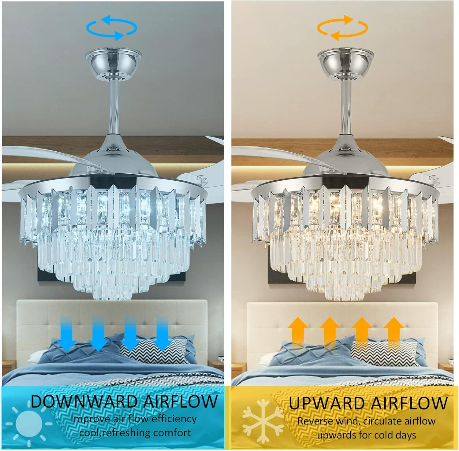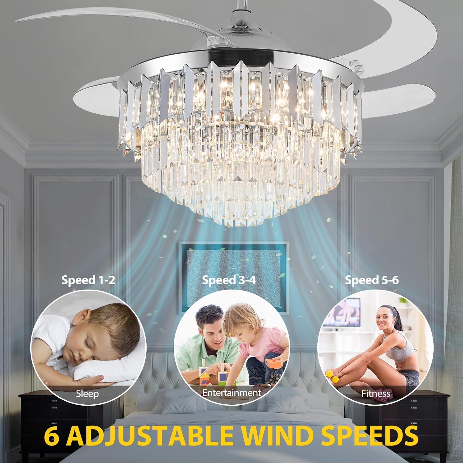 This ceiling fan is a game-changer! The modern design with crystal accents adds elegance to any room, and the dimmable LED lights create the perfect ambiance. The remote control makes it super convenient to adjust speed and brightness, while the retractable blades are a genius space-saving feature. It's both stylish and functional—definitely worth the investment!