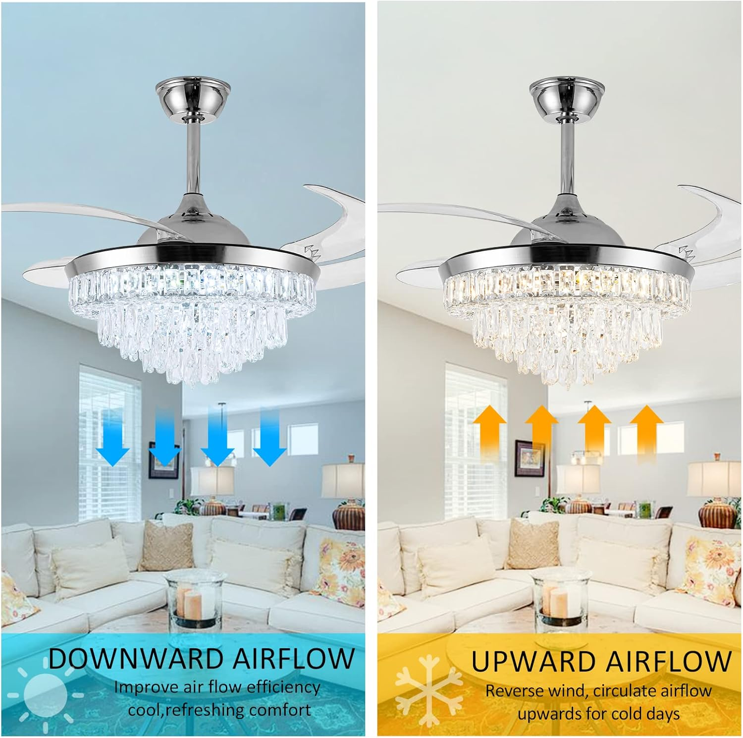 Store New Arrivals Add to Favorite View Feedback Contact Crystal Ceiling Fan with Light,42Inch Luxury Chandelier, Modern Stepless Dimmable Chandelier Ceiling Fan 6 Speed Indoor Fandelier Retractable Blade for Bedroom Living Room Dining Room Description Light Source Type LED Item model number 23 Style Modern Number of Items 1 Power Source Corded Electric Number of Light Sources 1 Control Method Remote Embellishment Crystal Batteries Included? No Lighting Method Remote Controller Type Remote Control Unit Count 1.0 Count Room Type Bedroom, Living Room, Dining Room Finish Chrome Finish Assembly Required Yes Installation Type Semi Flush Mount Material Metal Efficiency energy efficient Switch Type Remote Model Name Ceiling Fans Finish Type Chrome Finish Specific Uses For Product Home Included Components Remote Item Package Quantity 1 Indoor/Outdoor Usage Indoor Brightness Adjustable (10% to 100%) Country of Origin China Light Color Cool White, Nature White, Warm White Water Resistance Level Not Water Resistant Batteries Required? No Item Weight 24.6 pounds Light fixture form Ceiling Special Features Remote Controlled Special Feature Remote Controlled Bulb Base E26 Medium Shade Color silver Mounting Type Ceiling Mount Color Silver4 Wattage 36 watts Voltage 110 Volts Plug Format A- US style Recommended Uses For Product Remote control, Retractable fan blades,Color temperature changes & adjustable,Brightness dimmable,6 fan speed, Reversable blades,Timer, Silent motor Shade Material Metal Fixture Type Non Removable Size 42Inch Product Dimensions 42"L x 42"W x 23.9"H Number Of Pieces 1 【Unique Crystal Ceiling Fan with Light】It's the perfect combination with a crystal ceiling fan and chandelier light.42-inch silver chandelier fan with top k9 round crystal, acrylic clear retractable blades*4, metal lamp body. A variety of decoration styles can be a perfect match. Crystal ceiling fan with natural soft wind provides a healthy and super quiet living environment for family 【Two Rotation Modes and 6 Speed】chandelier fan provides 6-Gear fan speed. Reversible fan blades keep your room cooler in summer and improve indoor air circulation in winter 【Dimmable Brightness and Adjustable Color Temperature】Dimmable light brightness from 10% to 100%, and color temperature can be gradually adjusted from 3000K to 6000K(warm white, nature white, cool white). The chandelier ceiling fan also has a timer function (2h automatically turns off). All functions can be controlled by remote control 【Retractable and Reversible Fan Blades】The acrylic invisible blades will automatically extend/retract when the crystal fandelier is turned on/off. Diameter 42" when extended and 20" when closed 【Customer Service】The appearance of the fandelier is exquisite, Suitable for Indoor living rooms, bedrooms, dining rooms, corridors, etc. The fan needs basic assembly skills, a professional would be highly recommended. Any questions, please leave us a message, and we will handle it immediately Notice: Only ceiling fans with light controlled by a remote have memory function( It means, you set up natural lights by remote control before you turn off the light. and when you open it again, you will get the same natural lights) Product Description Color Temperature Dimmable (3000K-6000k) Light Wattage 36W Voltage 110V Dimensions 42 Inch, 4 Retractable Blades Brightness Adjustable(10%-100%) Applicable area 100-300 sq.ft. Timing Function 2hours automatically close Light Source Type LED(Light Kit Included) ABOUT US We offer the best prices around on high quality products. Our E-store includes media such as books, movies, music and games while offering electronics, toys, sporting apparel, clothing, tools, general home, garden items and more. SHIPPING We are always working hard to ensure your package arrives as soon as possible. Please understand that some factors like weather, high postal traffic, and the performance of shipping companies are outside of our control. We offer free shipping to the lower 48 states and ship within 2 business days of payment, usually sooner. We do not accept P.O. Boxes. Please provide a physical address. For shipping outside of the continental USA, we only use eBay's Global Shipping Program.The item is shipped to KY and then sent to the rest of the world. International customers are responsible for all duties and taxes. Continue to check out in order to calculate costs for shipping the item to your country. Messages regarding eBay's Global Shipping Program MUST be directed at eBay EXCLUSIVELY. RETURNS We offer a 30-Day Return Policy on items which you are not completely satisfied with. You have the option for a full-refund or an exchange of the item. No returns are available on items shipped outside of the USA. PAYMENT We accept PayPal. CONTACT US This page content is yet to come Please ad us to your favorite seller and visit again later Thank You CUSTOMER SATISFACTION We try our very best to make sure every customer is completely satisfied. If there's a problem, message us! We're happy to help. WE ACCEPT Copyright © 2021 AutoDS. | All Rights Reserved