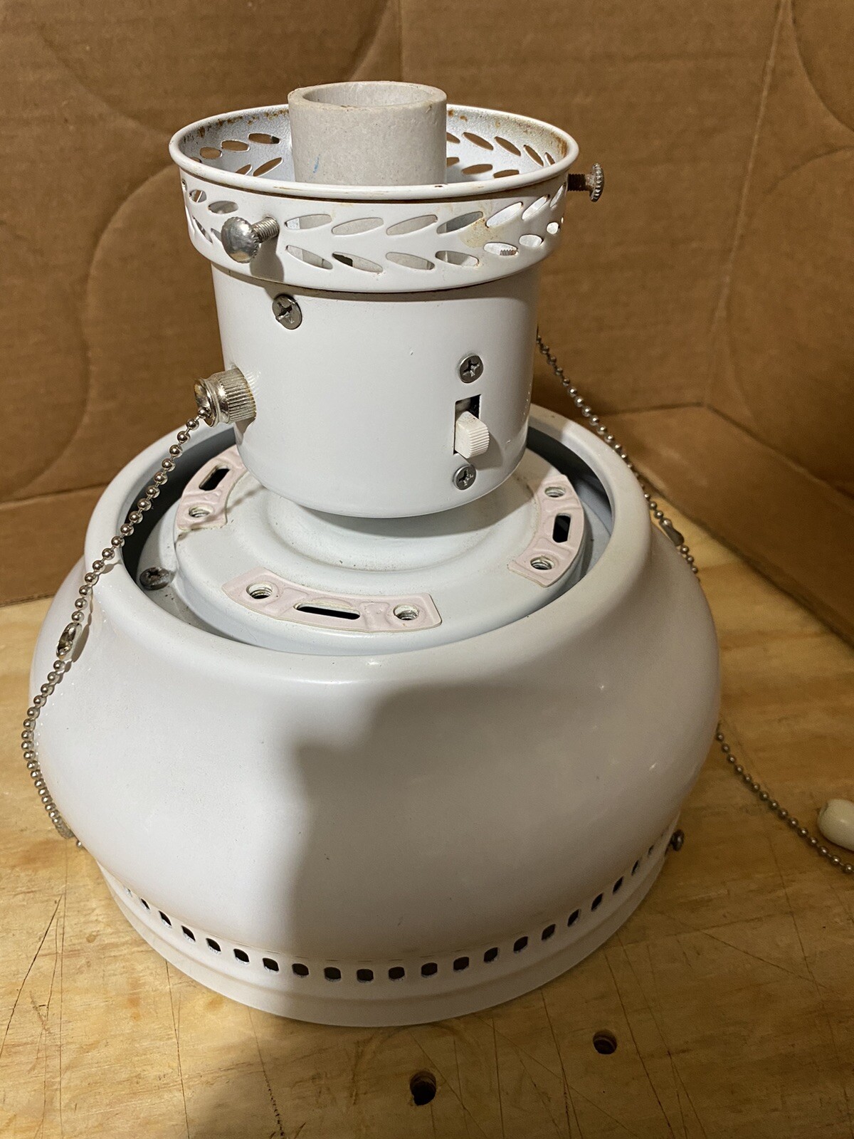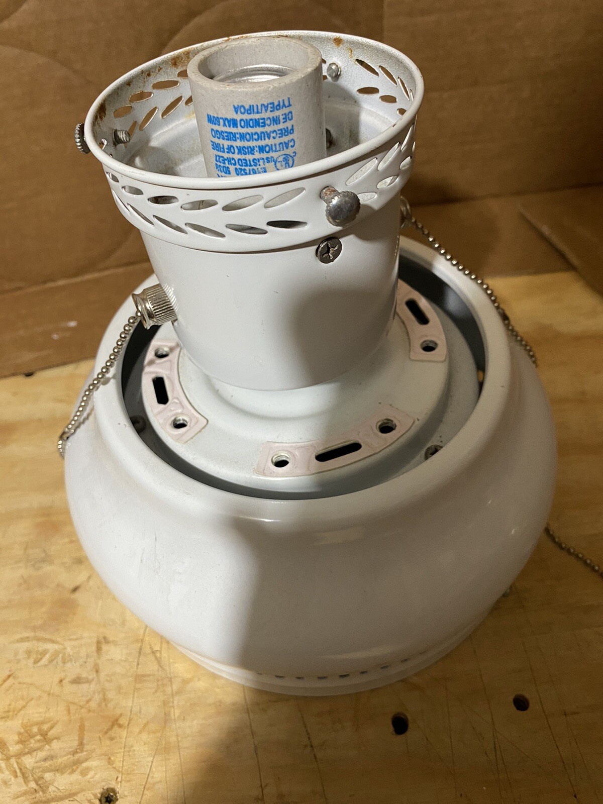 CEILING FAN 42” WITH LIGHT. PULL CHAIN. USED. NO GLOBE. WHITE / WOOD GRAIN BLADES. Good condition Any questions please email me. Thank You for looking and have fun. I will combine shipping where possible. Check out the other items I have for sale. PHOTO'S ARE PART OF MY ITEM DISCRIPTION. PLEASE LOOK THEM OVER CAREFULLY TY.