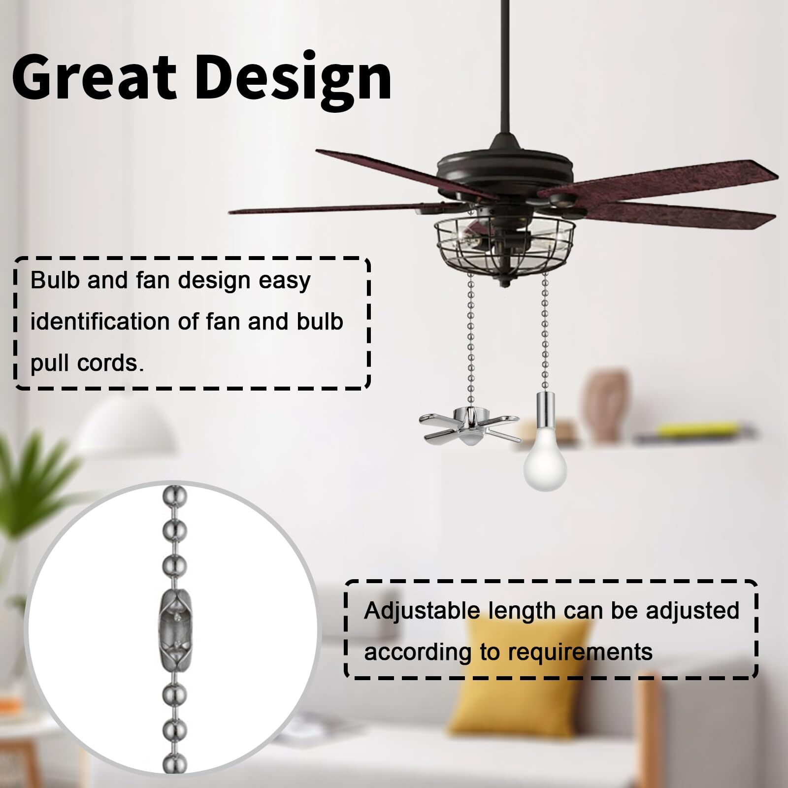Exclusive Offers Await! Welcome to our stores! Satisfaction is what we guarantee. Ceiling Fan Pull Chain, 4 Pieces of 12 Inch Bulb and Fan Pattern Pull Chain Extender Fit All Standard Ceiling Fans And Light Fixtures, Ceiling Fan Pull Chains With Decorative Product Overview Key Features VERY DURABLE: This ceiling fan drawstring (12 inches/pc) is made of metal, very durable and not easy to rust. PERFECT DESIGN: This ceiling fan pull cord is designed with fan and light bulb, you can easily recognize which module the pull cord is controlling when you use it. WIDE APPLICATIONS: Exquisite design, suitable for all kinds of ceiling fans. Both indoor and outdoor are perfectly compatible EASY TO USE: Extended length 12 inches ceiling fan zip ties can also be easily cut or connected with an extension cord to reach the desired length. Payment Information ★ Secure payments through eBay. ★ We accept PayPal and all major credit cards. ★ Immediate payment required upon purchase. ★ For any payment issues, please contact our support team. Shipping Information ★ Orders are shipped to the address provided during checkout. Please verify your address. ★ We process orders within 1 business day (excluding weekends and holidays). ★ Standard delivery time is 3-5 business days. ★ We use trusted carriers like UPS, FedEx, and USPS. ★ Shipping is only available within the contiguous United States. No shipping to Alaska, Hawaii, Puerto Rico, or PO Boxes. ★ If there are any shipping delays, please contact us for support. Return Policy ★ We offer a 30-day return policy. ★ If you are not satisfied with your purchase, you can return it within 30 days for a full refund. ★ Please contact us to obtain the return address before sending back any items. ★ Items must be returned in their original condition and packaging.