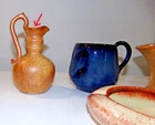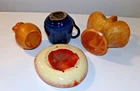 Great 4-piece collection of handcrafted North Carolina art pottery attributed to the Cole family based on certain characteristics such as color of clay, rutile glaze and brushed bottoms on all pieces. The mug (with glaze flake on handle) is attributed to Nell Cole Graves who was able to achieve the thinnest edges on small pieces. Please note the small chip on the 5-1/2" Rebecca pitcher and tiny nicks around bottom edge of the 6" basket. Ashtray has no damage. Carefully packaged and shipped within a few business days of a completed sale. We are experienced shippers and carefully plan each package. We have successfully packaged and shipped over 5,000 fragile items in the past 25 years. Your order will receive our immediate attention . Thank you!