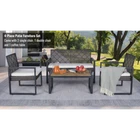 MODERN SET IN COZY HOME: Versatile and stylish outdoor patio furniture set, designed to elevate your outdoor living space with comfort and elegance. Crafted from high-quality PE rattan, powder coating frame with solid acacia wood, this set combines durability with a sleek aesthetic, perfect for any patio, balcony, porch, garden, backyard and lawn. NATURAL LOOK TABLE: Conversation patio furniture set brings a unique blend of rattan and wood. The natural look from sustainable solid acacia wood and the modern look of modern brown rattan is perfect for any space. Complete the assembly with few steps and enjoy leisurely moments outdoors. with drinks, snacks, or decorative accents. STURDY CHAIRS: The spacious double chair provides ample seating for two individuals, allowing you to unwind and enjoy the outdoor moments. Its ergonomic design ensures optimal comfort, while the sturdy plastic rattan construction guarantees long-lasting use and a high weight capacity of up to 705 lbs for double chair and 363 lbs for single chairs. All of the chair legs own adjustable nuts which brings to comfortable experience. DURABILITY MATERIAL: Durable and weather-resistant materials hold up to the elements; anti-rust and anti-corrosion treatment thanks to qualified polyester rattan, high-quality powder coating frame, UV tested cushion cover and acacia wood with water-based oil protection. ONE SET: includes one dounle chair size 44 x 23.82 x 29.92 inches; two single chairs size 23.82 x 23.22 x 29.92 inches, one table size 33.07 x 17.51 x 15.16 inches, clear instruction paper and extra a free part of hardware for replacing in case needed. Product Material Rattan Made by polyester, can be recycled, mixture light brown color Frame Steel with powder coating, black color Cushion Cover: Polyester fabric, density 160gsm, waterproof, black color Polyester wadding and a non-woven fabric layer batting cushions Zipper: yes / removable Wood Thickness 12mm, Acacia solid wood from sustainable sources Weight Capacity Double chair 705 lbs Single Chair 352 lbs Table 155 lbs Certificate ISO 9001:2015 Factory ISO 105 B02:2014 Fabric