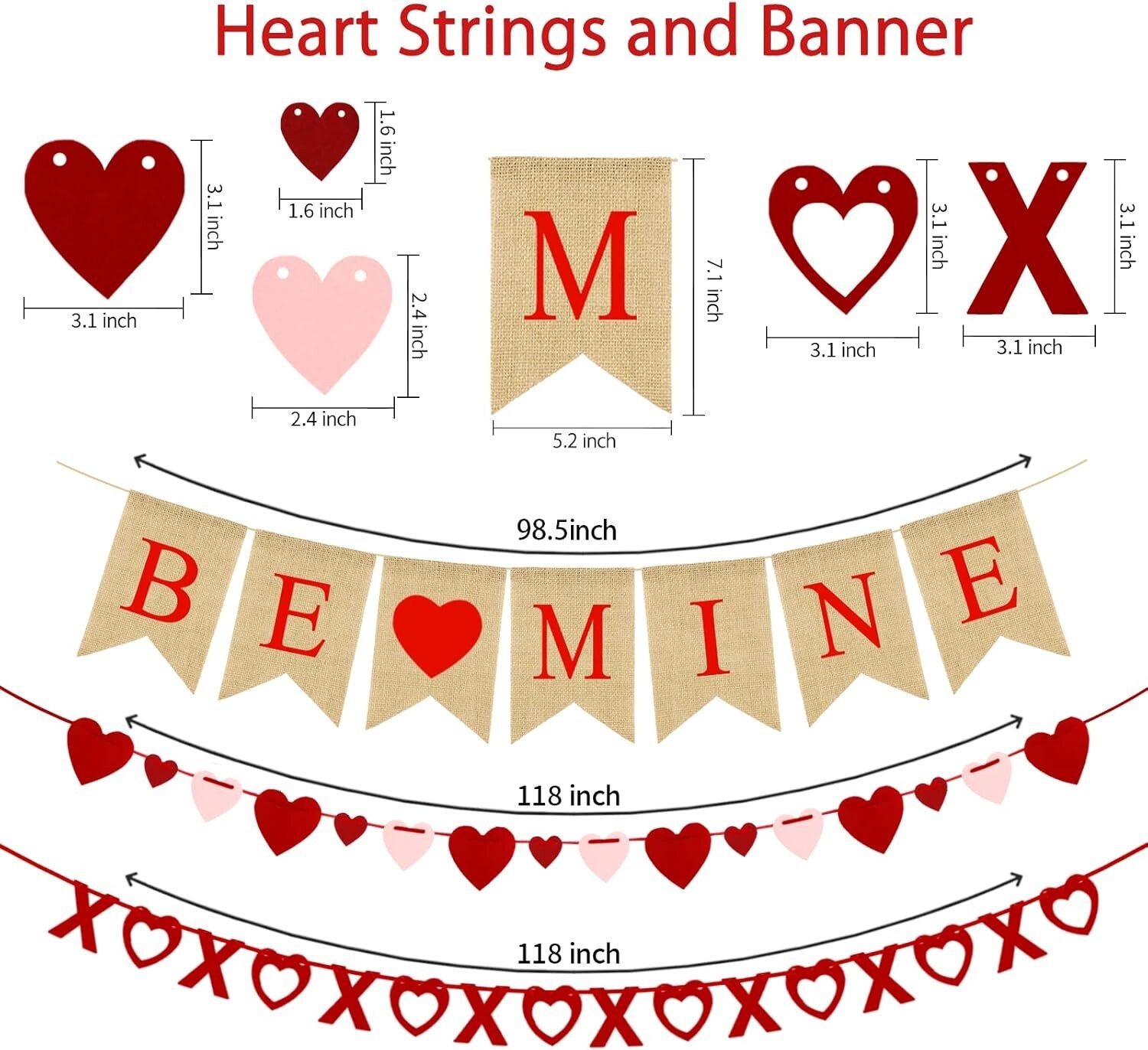 4Pcs Valentines Day Decorations Set No DIY Required BE MINE Love Heart XO Garlands Banner for Home Classroom Office Wedding Party Anniversary BE MINE BANNER : The Valentine's Day decorations set creates a romantic atmosphere, adding a sweet touch and surprise to your celebration. Hang it on walls, tables, windows, doors, or fireplaces to enhance the party vibe. HIGH-QUALITY MATERIAL : Made of eco-friendly, lightweight, and durable materials. The banner set is odor-free and easy to store, perfect for Valentine's Day, anniversaries, weddings, and home or farmhouse decor. WELL DESIGNED : The set includes 1 "Be Mine" banner, 2 heart strings, and 1 XO string. Each banner measures 7.08x5.12 inches, with heart and XO elements measuring 3.15x3.15 inches, making it ideal for home or party decor. EASY TO USE : Pre-assembled for convenience with adjustable distances between banners. The set can be disassembled and reassembled, allowing you to create your own personalized romantic decorations for any setting. B0BK22ZZC1