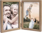 Love this double picture frame! The wood grain looks elegant, and the glass keeps photos crisp and dust-free. The sturdy hinge lets it stand perfectly or fold flat for storage. Holds two 4x6 pics side by side—great for displaying favorite memories. The MDF material feels solid, and the metal hinge is smooth and durable. Perfect for desks, shelves, or gifting!