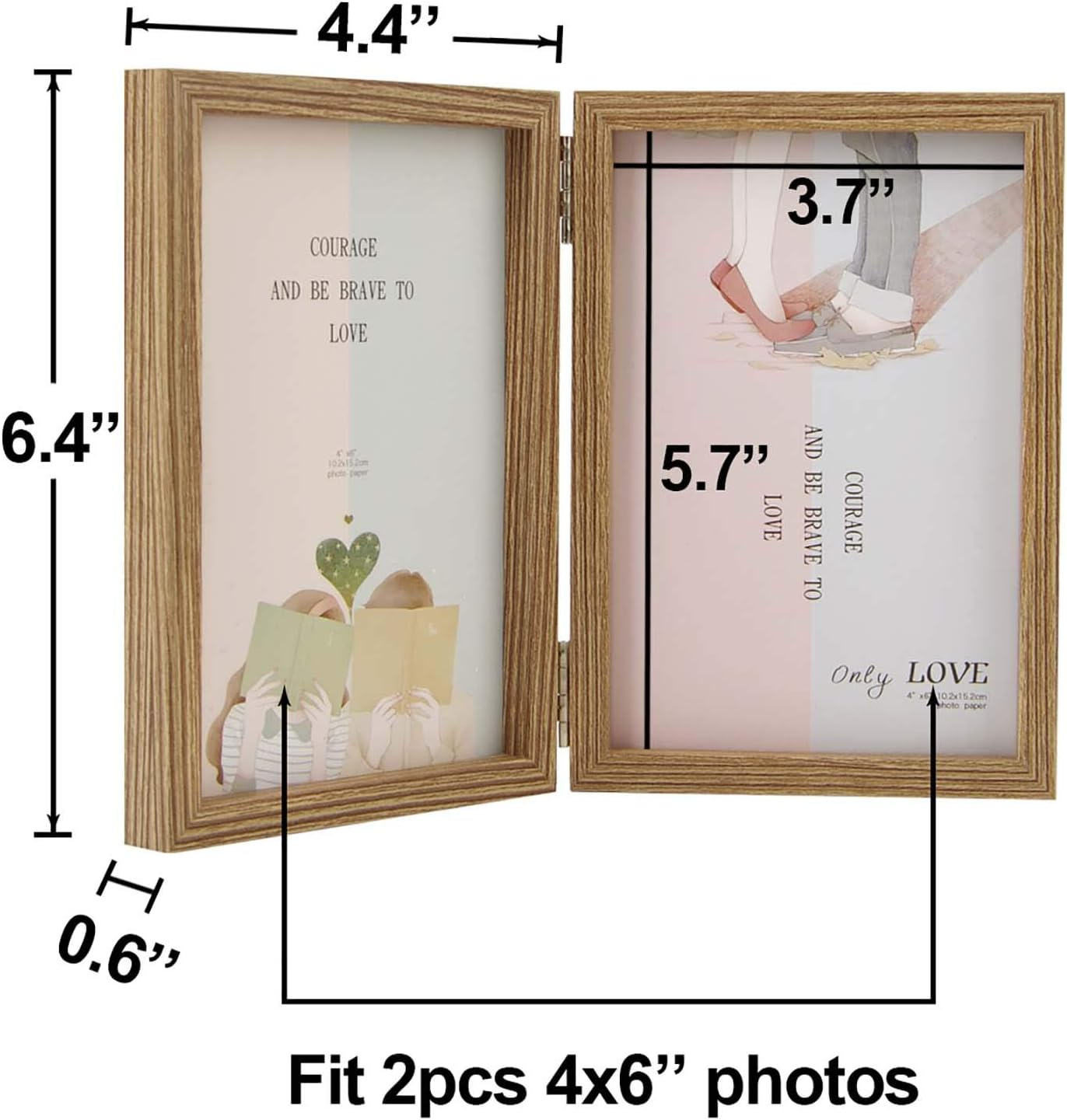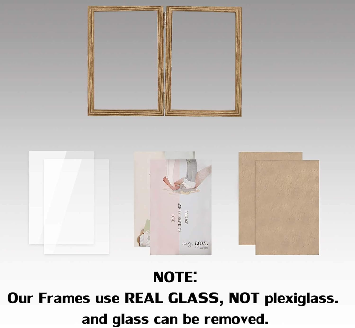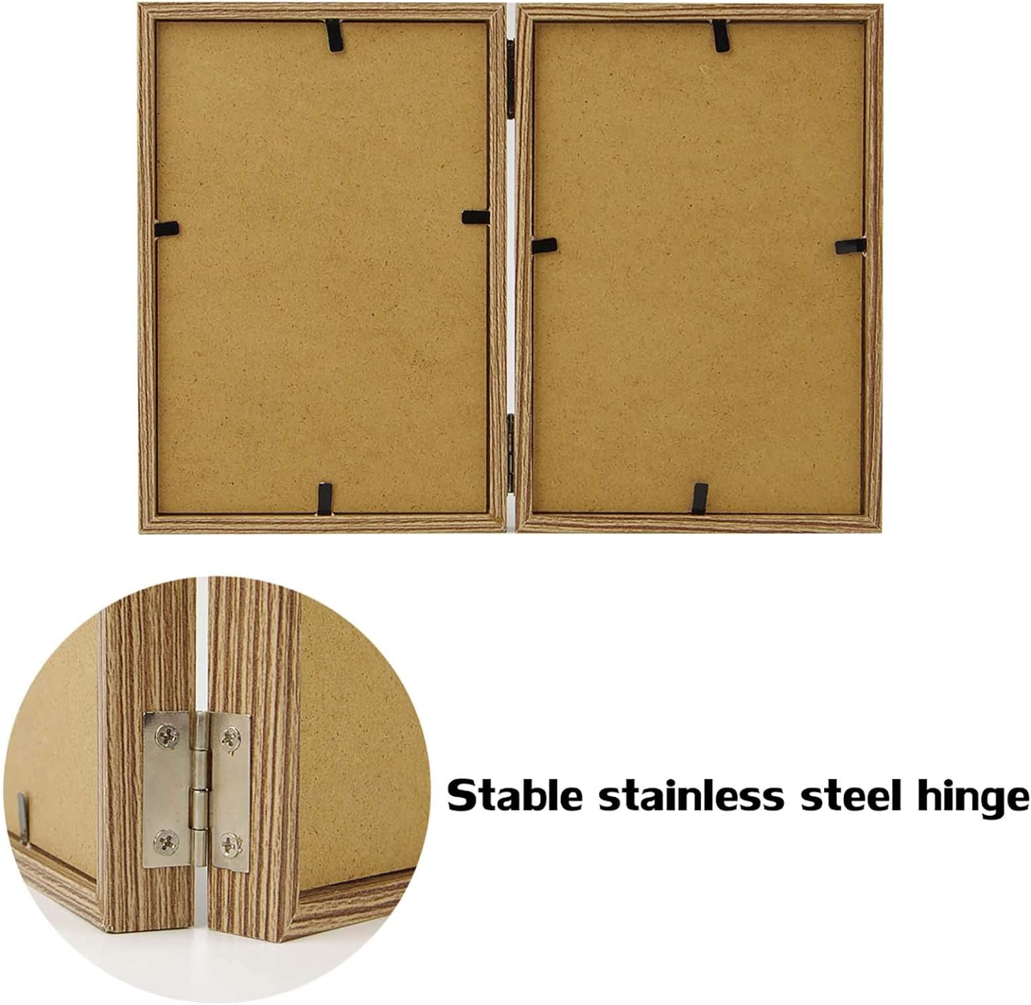 4x6 Picture Frames Double Hinged MDF Wood Grain with Glass Front Stand Vertical on Tabletop Double Picture Frames: With 2 openings, fits two 4x6 pictures side-by-side for desktop display. Hinged 4x6 inch picture frame, perfect for your cherished memories. Real Glass: High-definition, dust and moisture-proof. Increase transparency, make photos look clearer. Material: Made of sturdy MDF Wood, no distortion, no peculiar smell. Stable multi-functional stainless steel hinged, moisture and rust-proof, can be 180° rotary folding. Placing: 0.6in thick enough to be placed directly on the desktop, no need with any other support. The backing fixed with four tabs. Move the tabs directly, opens up easily in the back for inserting photos. Picture and locking back fits tightly. Protective Packaging: Packaged in box to ensure it arrives safely! Great for children, family, couples, friends or as Christmas present. Product Description Picture frame like a family history, which condenses the warmth and glory of the family, treasured a beautiful moment, merges into the heart and becomes a permanent memory. Metal hinged Each frame is hinged with strong metals. Can be flipped 180°, place the angle as you like. And easy to fold and save space. Real Glass High-definition, dust and moisture-proof glass. Increase transparency, make photos look clearer. Open Tabs 4 metal tabs on the back, easy to mounting your favorite photos. Sturdy, don't worry about falling.